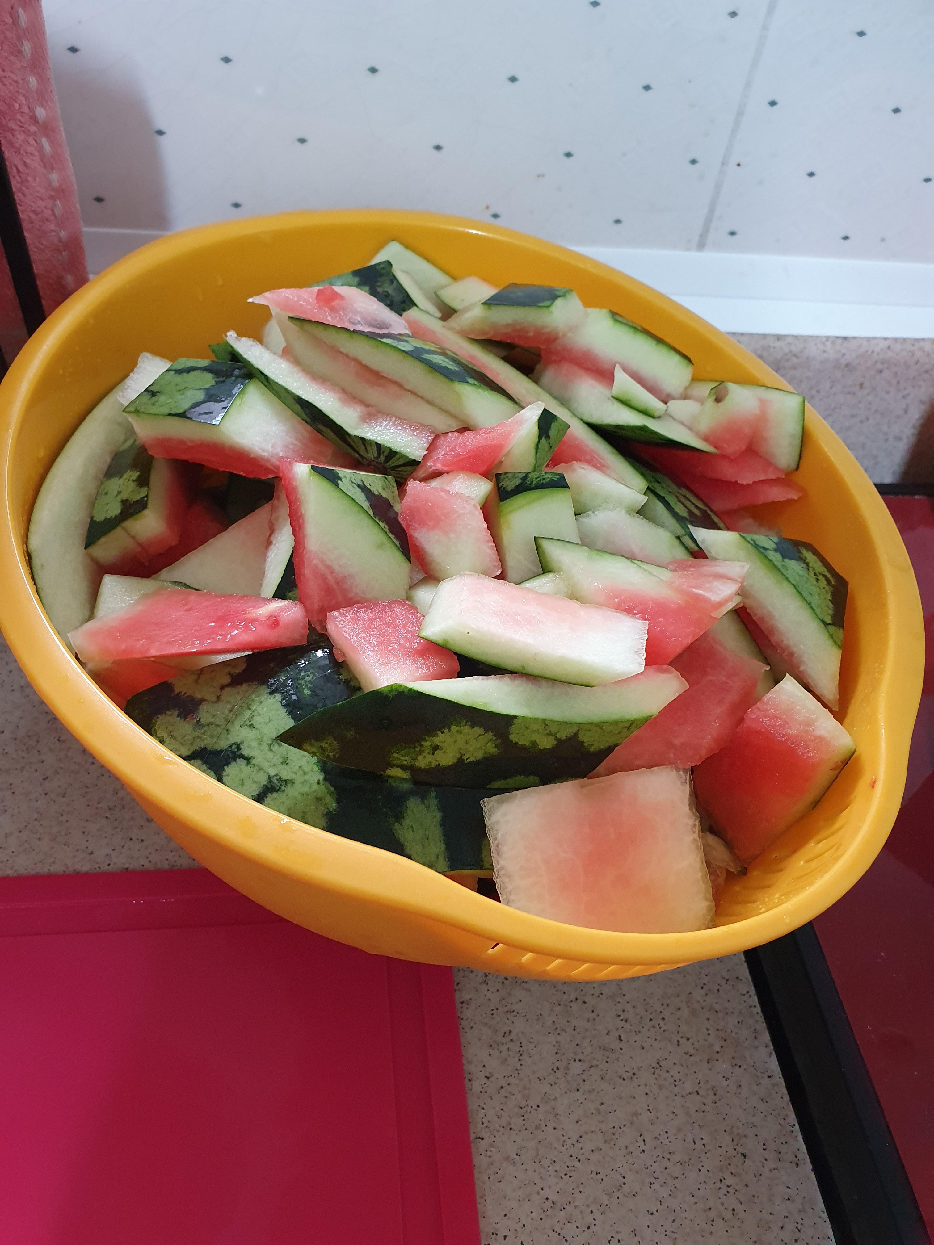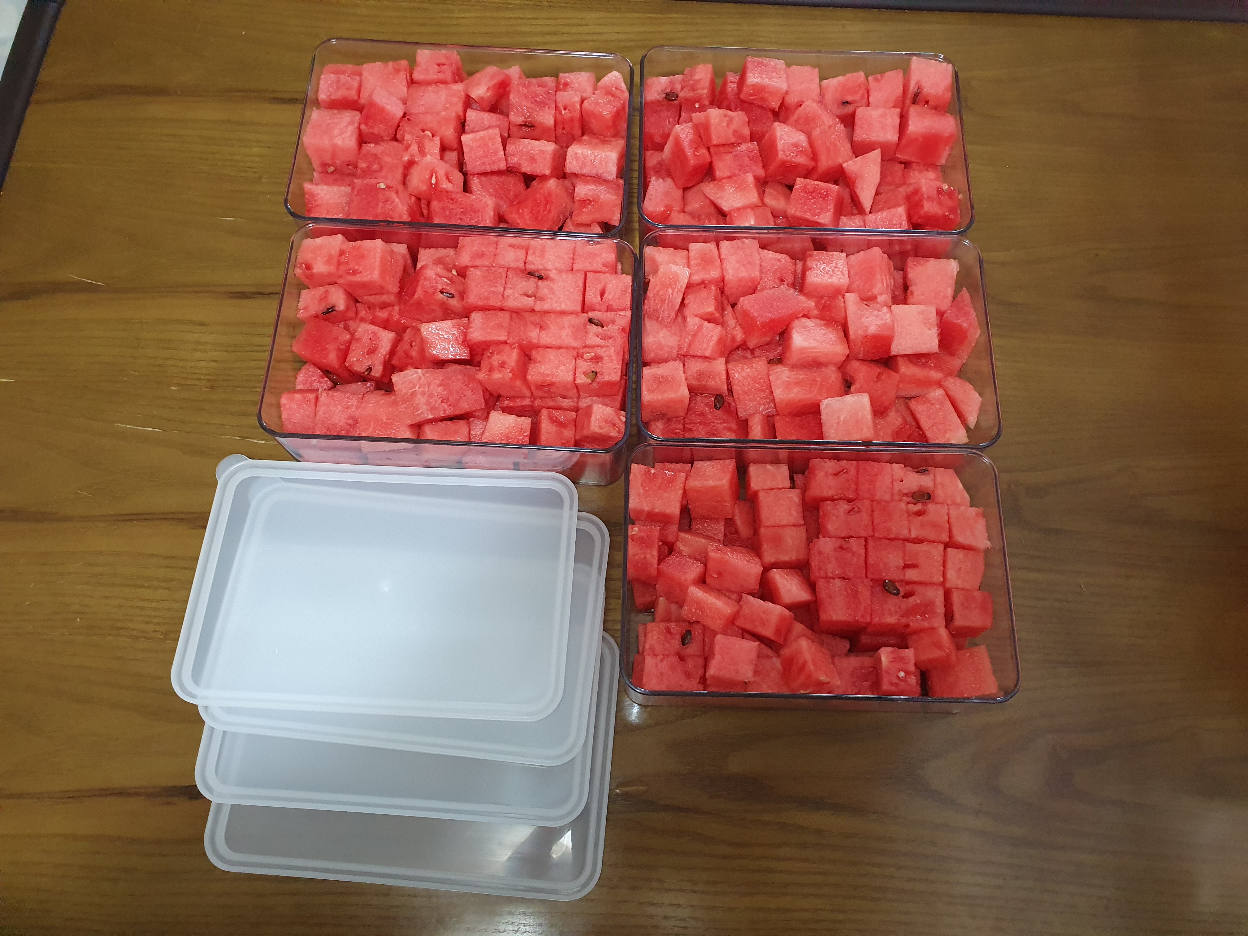 7월 중순에 어른 머리 하나만한 수박 한통을 사서 열심히 분해를 했다. 5개의 그릇에 꽉꽉 채울 수 있었다.