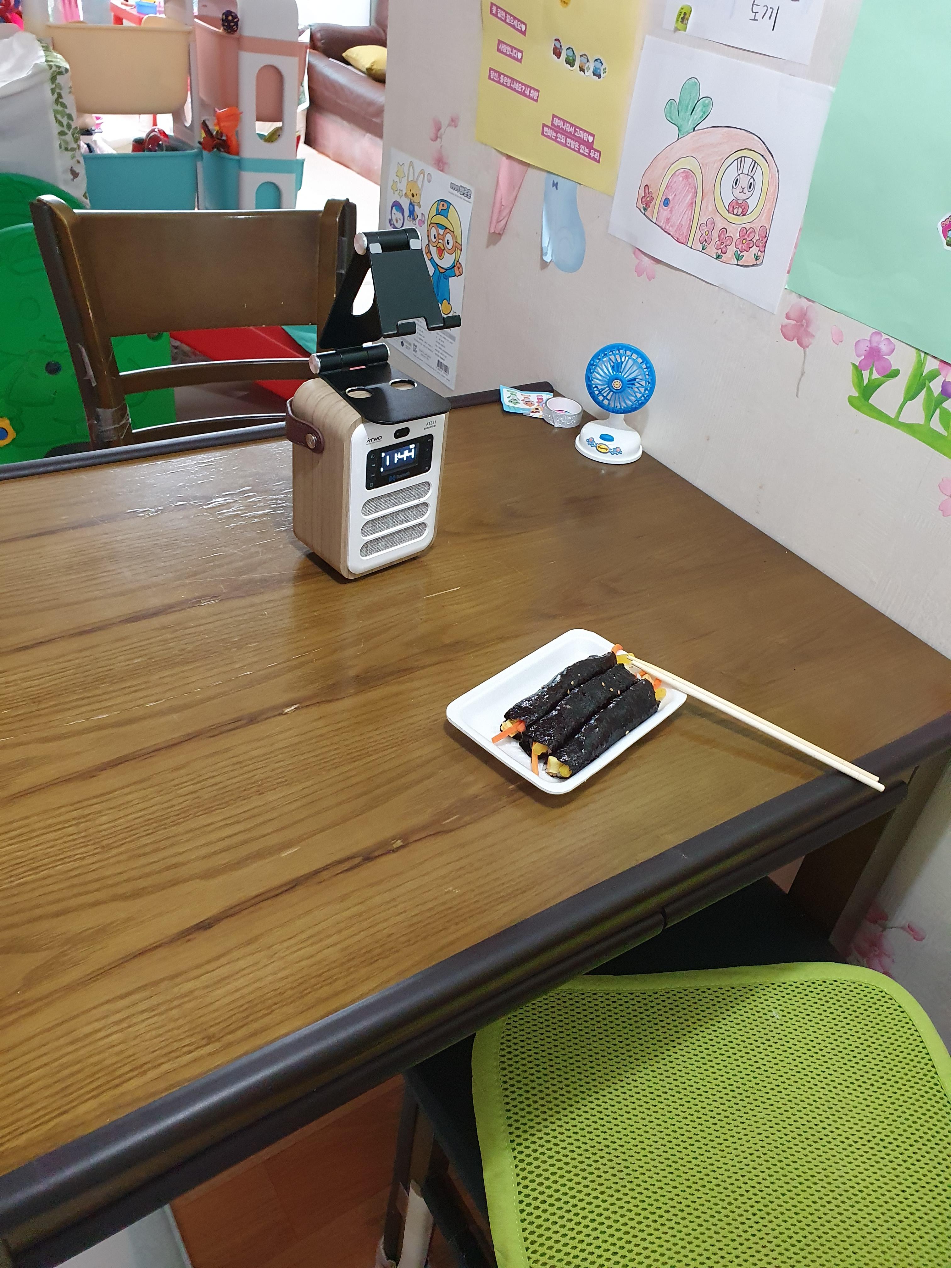 블루투스 스피커로 라디오를 듣거나 유튜브를 본다.