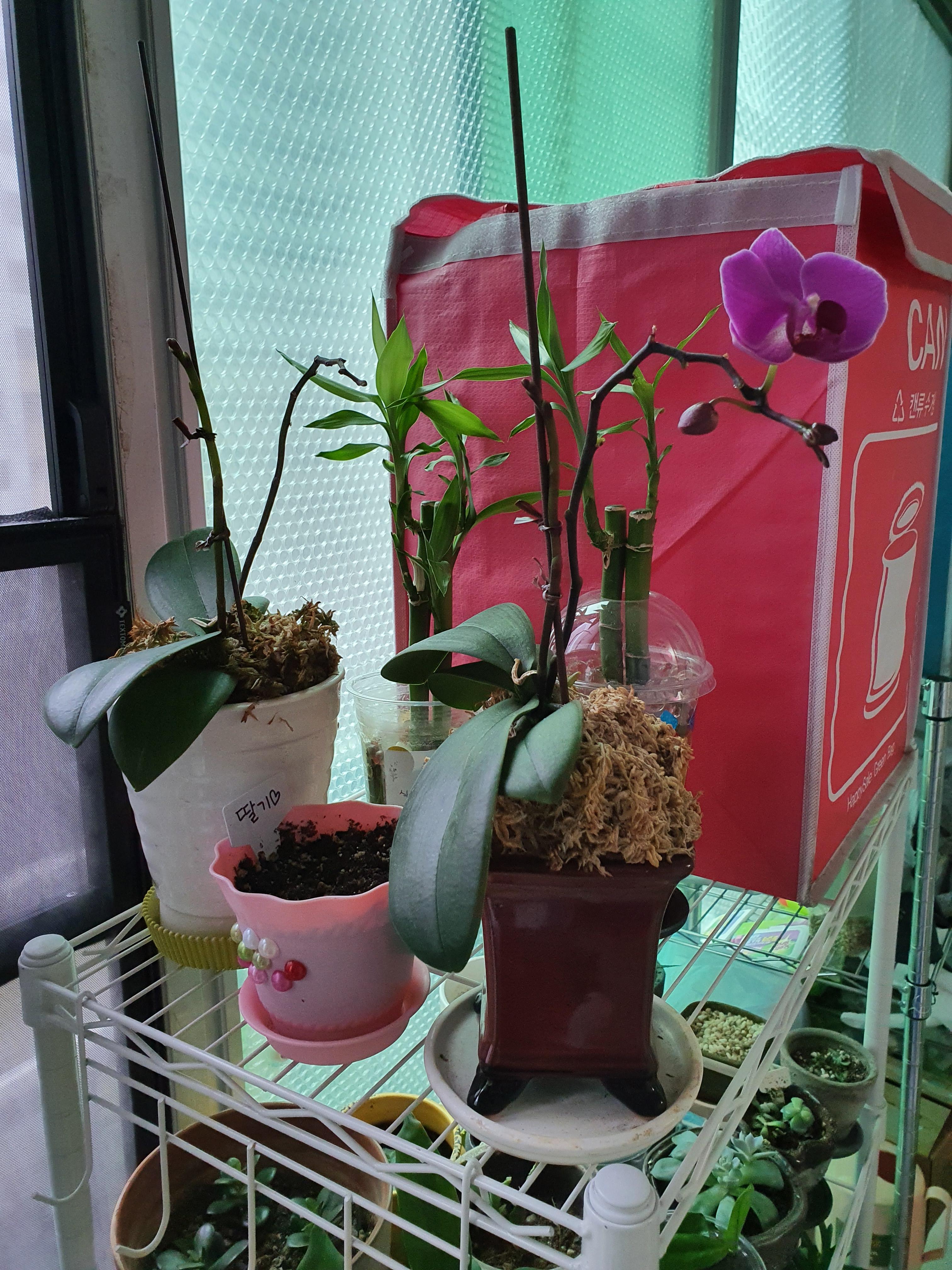 호접란 화분 2개 동시에 꽃대가 새로 올라왔다.