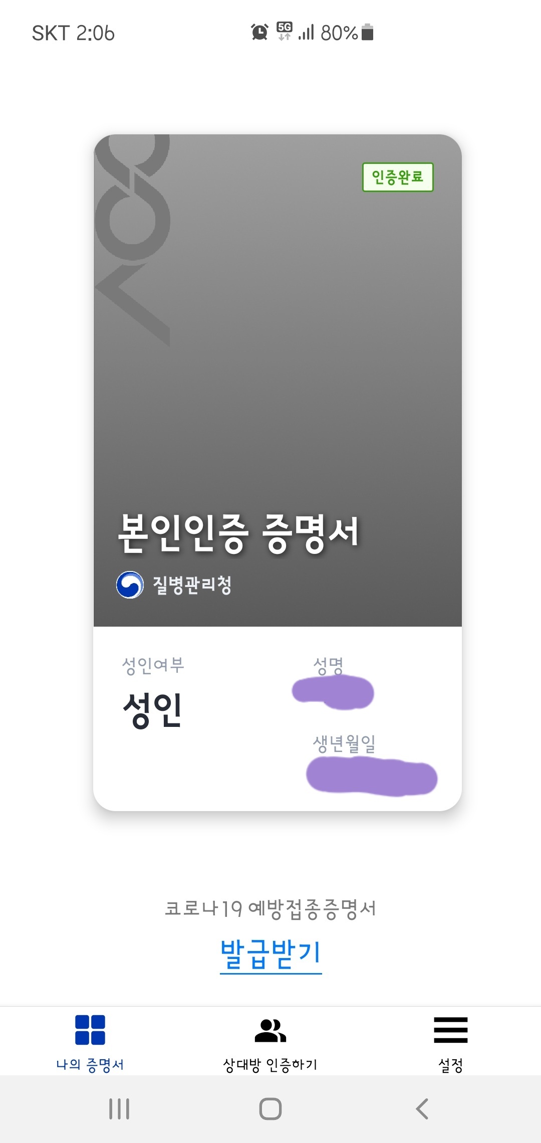 코로나19 전자 예방접종증명서 발급 : 본인 명의의 핸드폰을 소유한 경우 가능