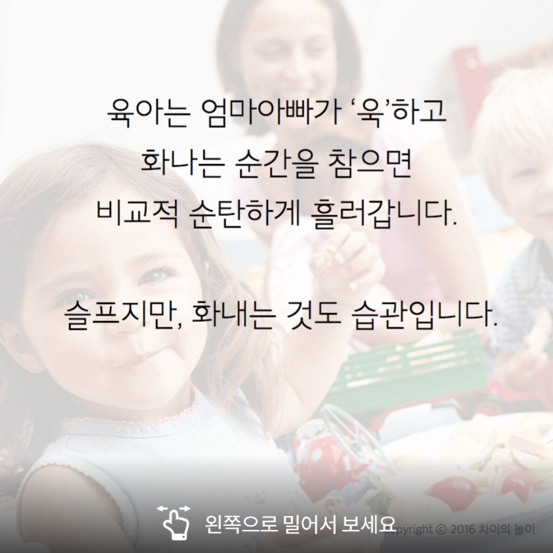 아직 아이는 아이입니다. 아이 때문에 감정이 출렁출렁 거릴 때도 많지만, 아이의 안정적인 정서 발달을 위해 한 번만 숨을 고르고 아이를 대해주세요. 아이는 엄마의 인내심을 바탕으로 밝고,
