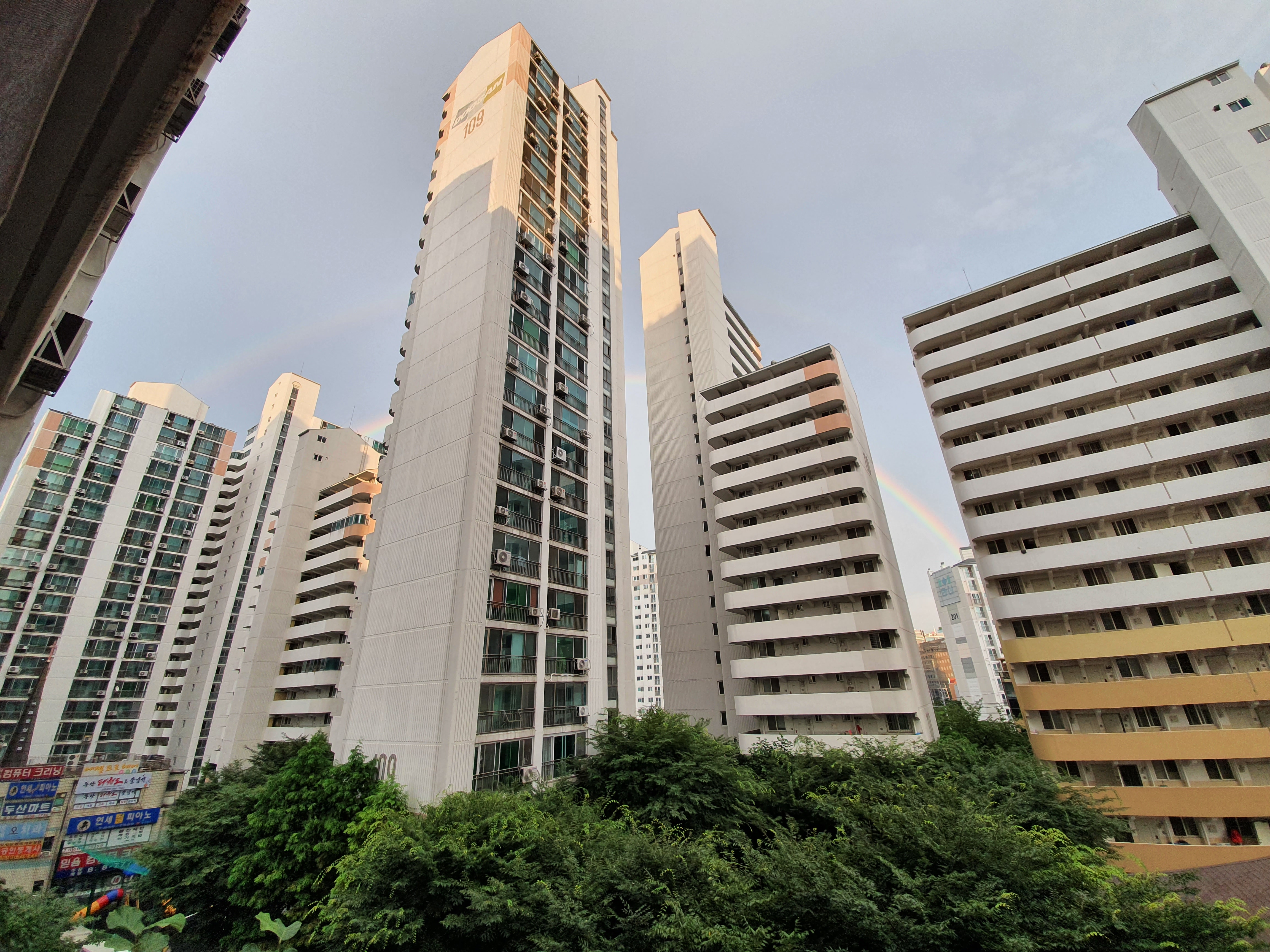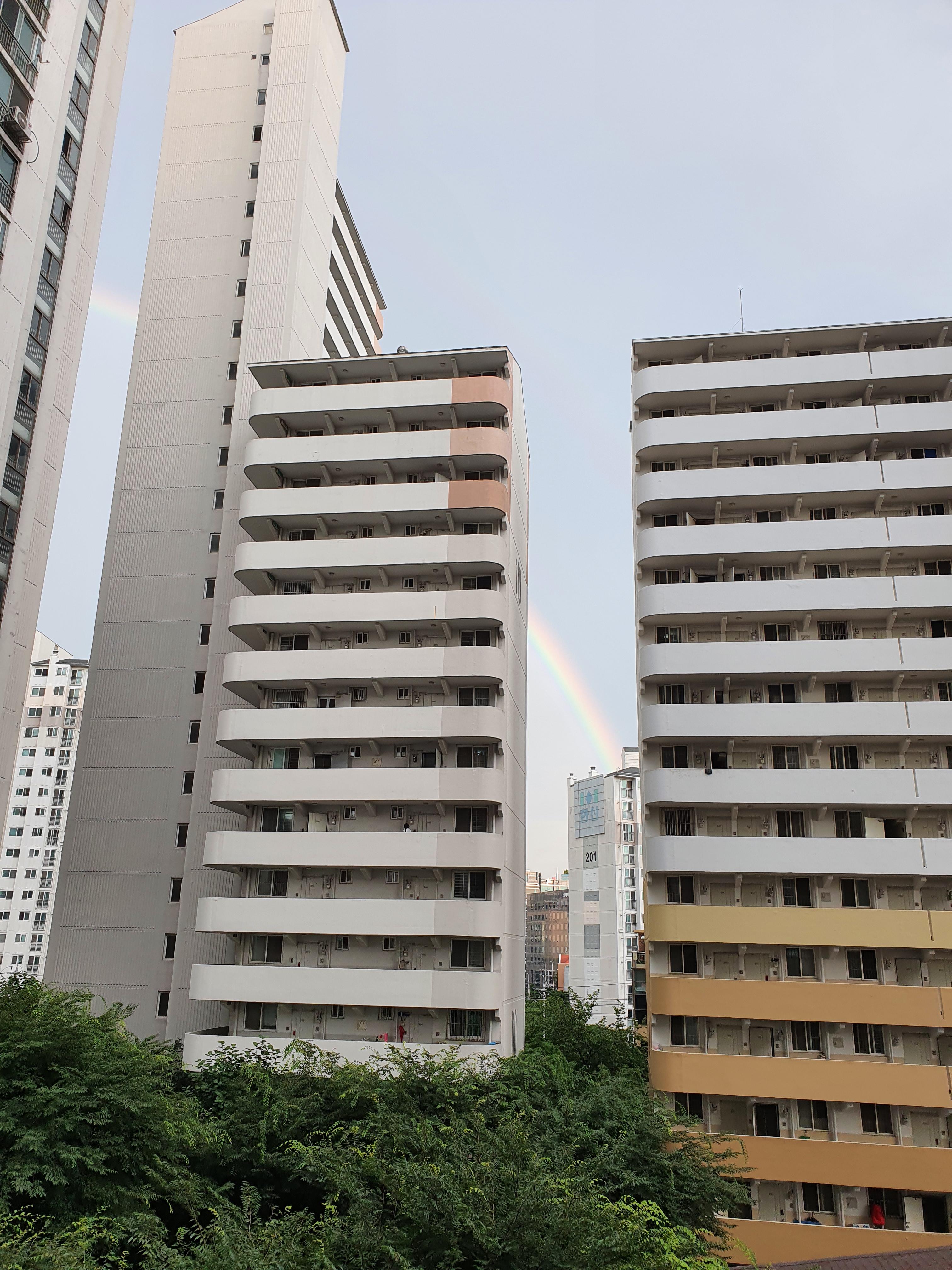 오늘도 갑자기 시꺼멓게 구름이 가득 몰려오더니 소나기가 내렸다. 그러다가 그쳤는데, 이렇게 살짝 무지개가 떴다. 사진으로는 작게 보이지만 꽤 컸다. 잠시동안 구경하다가 들어왔다. 5분쯤