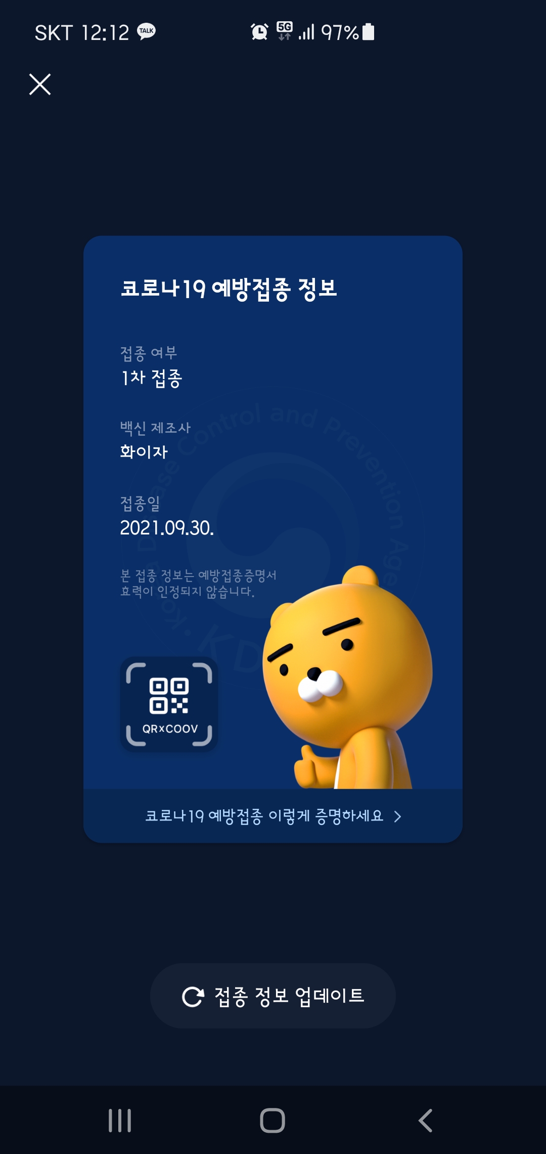 코로나 백신 1차 접종 : QR코드 화면 하단에 '1차 접종'이라고 뜬다. 본문