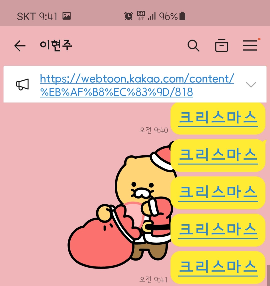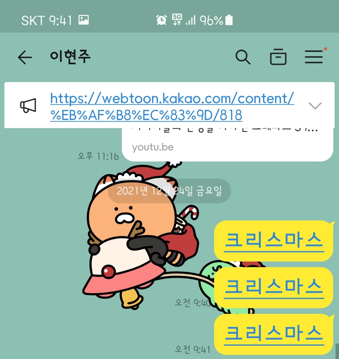 카톡 메시지창에서 "크리스마스"라고 입력하니 순간 카톡 배경이 바뀌었다.