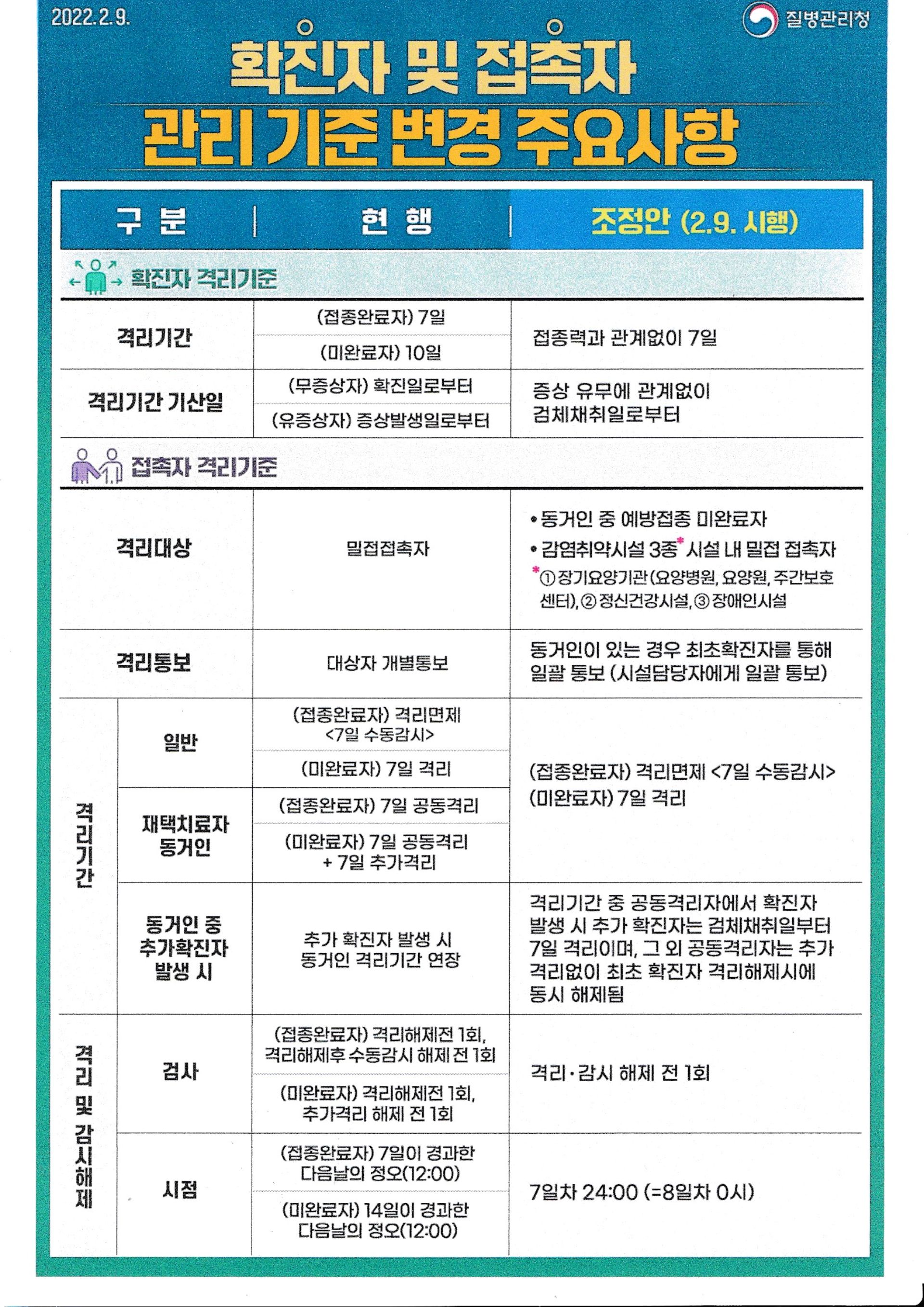 확진자 및 접촉자 관리 기준 변경(2022.02.09) : 아파트 관리사무소 공지 본문