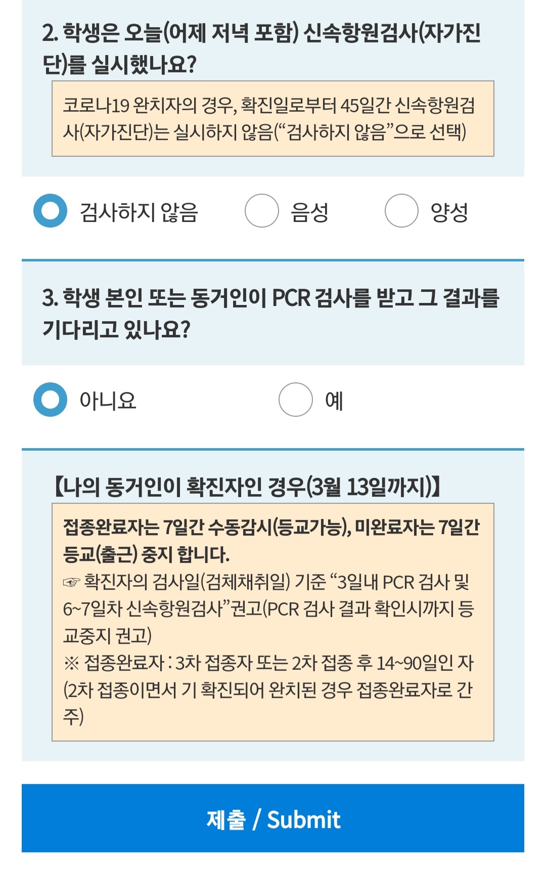 (2022.03.07) 건강상태자가진단 앱 설문내용 : 코로나 완치자 등교 때문에 고민하는 사람이 많은가보다.