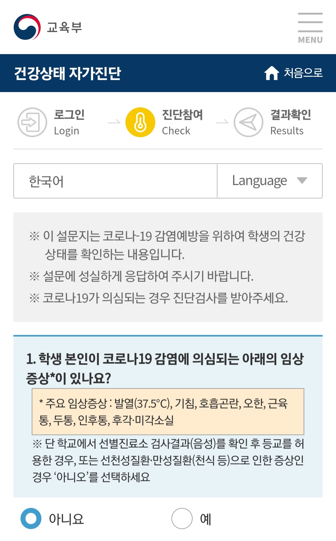 아침마다 하는 건강진단앱 설문지 내용 중에도 박혀있다. 재검 필요없다고...