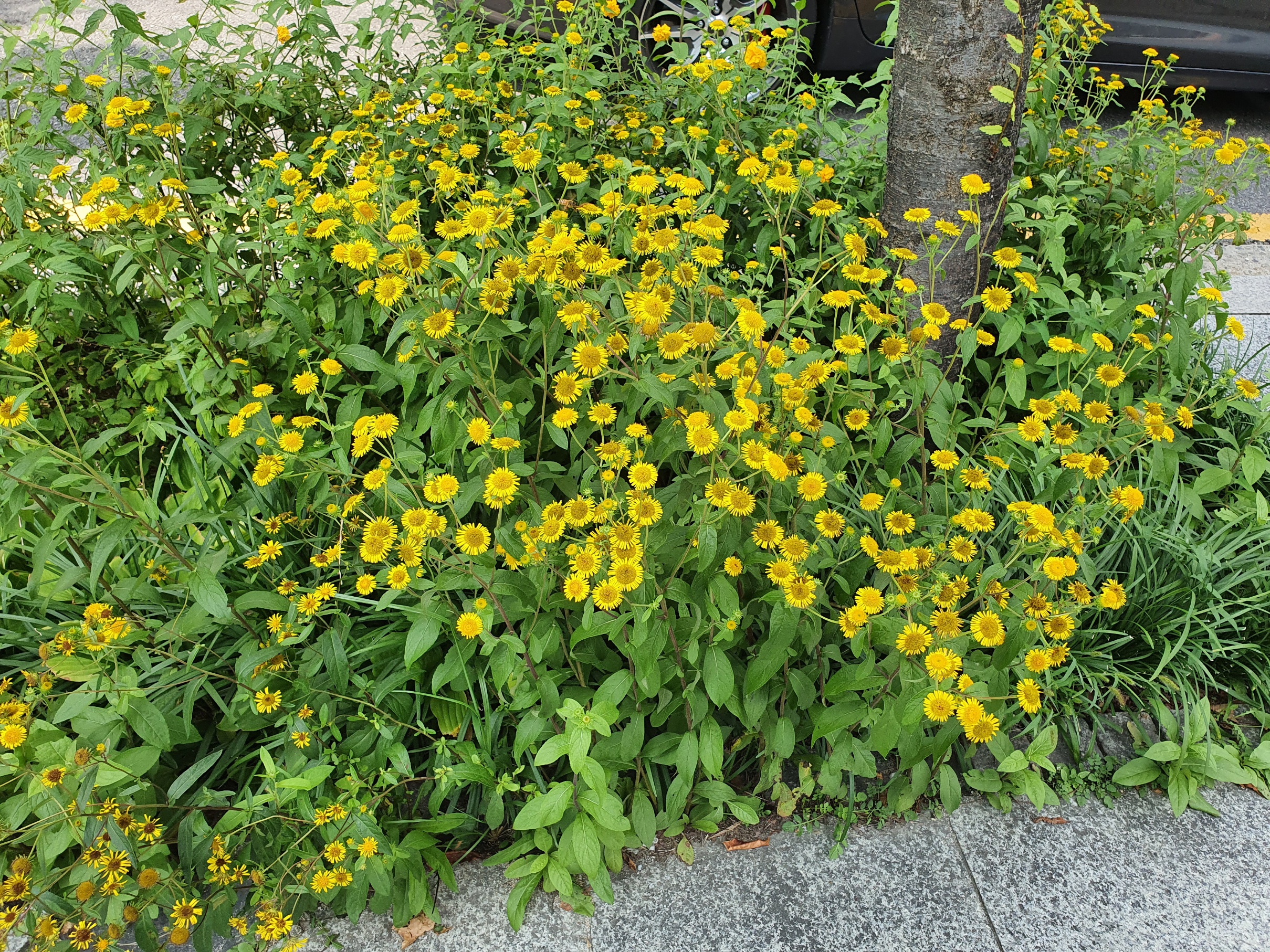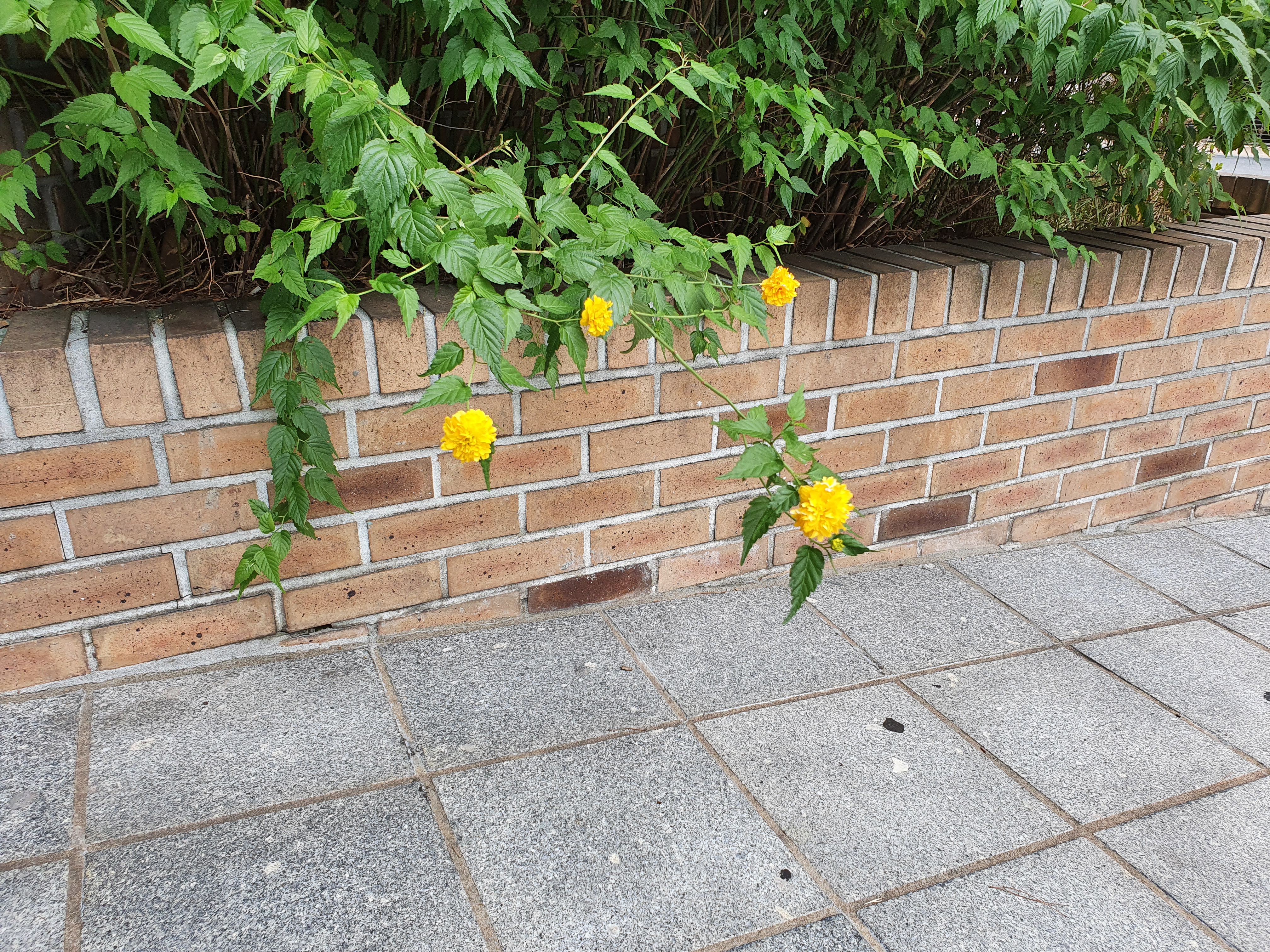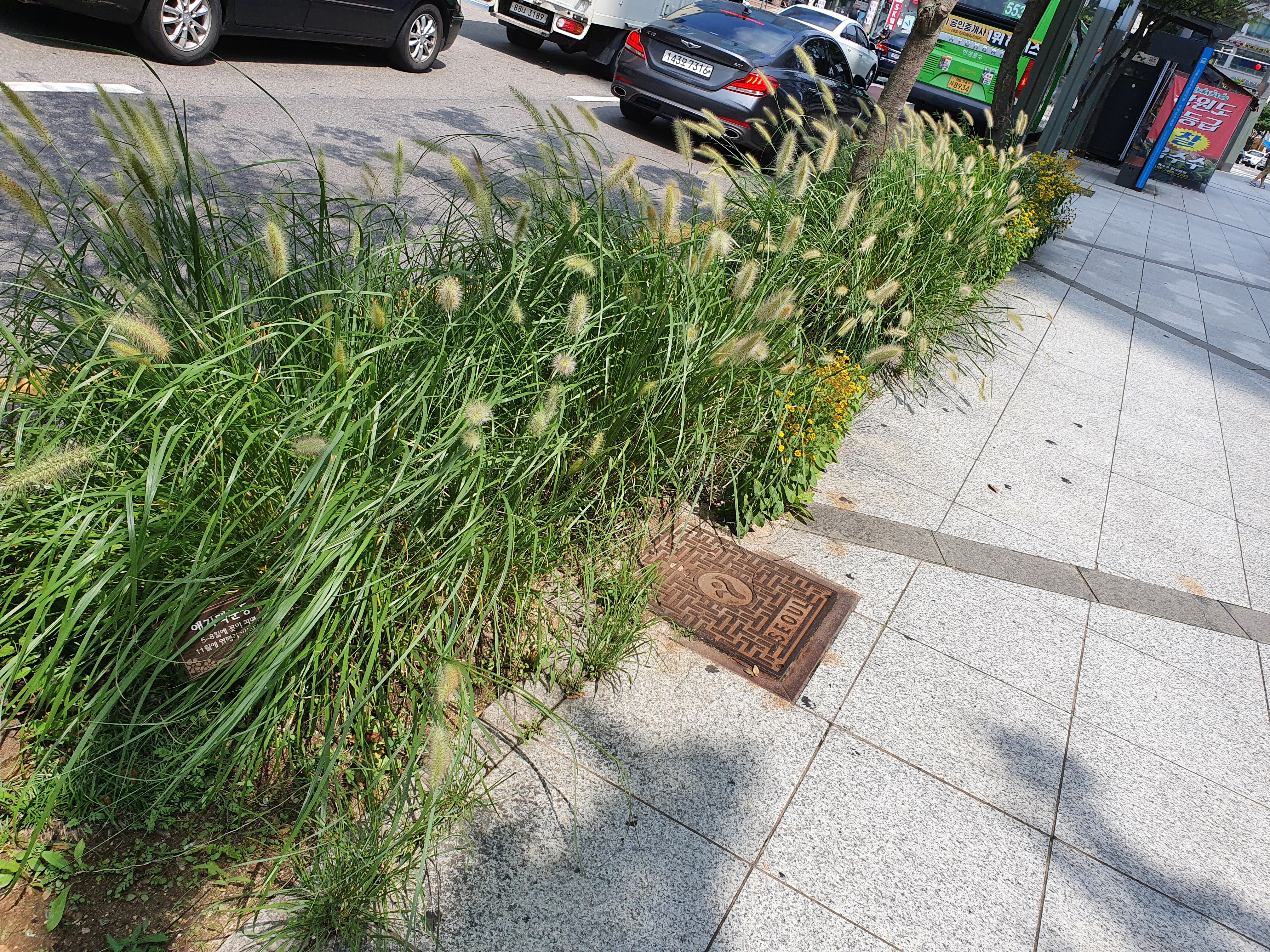 도로가 화단에 활짝 핀 예쁜 꽃을 보았다.