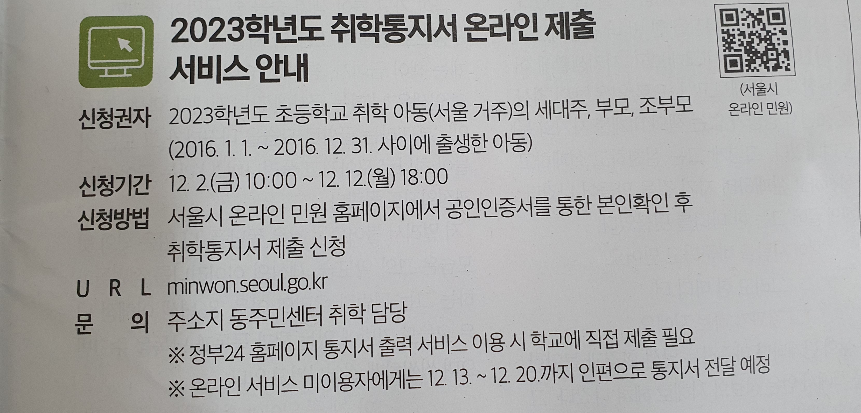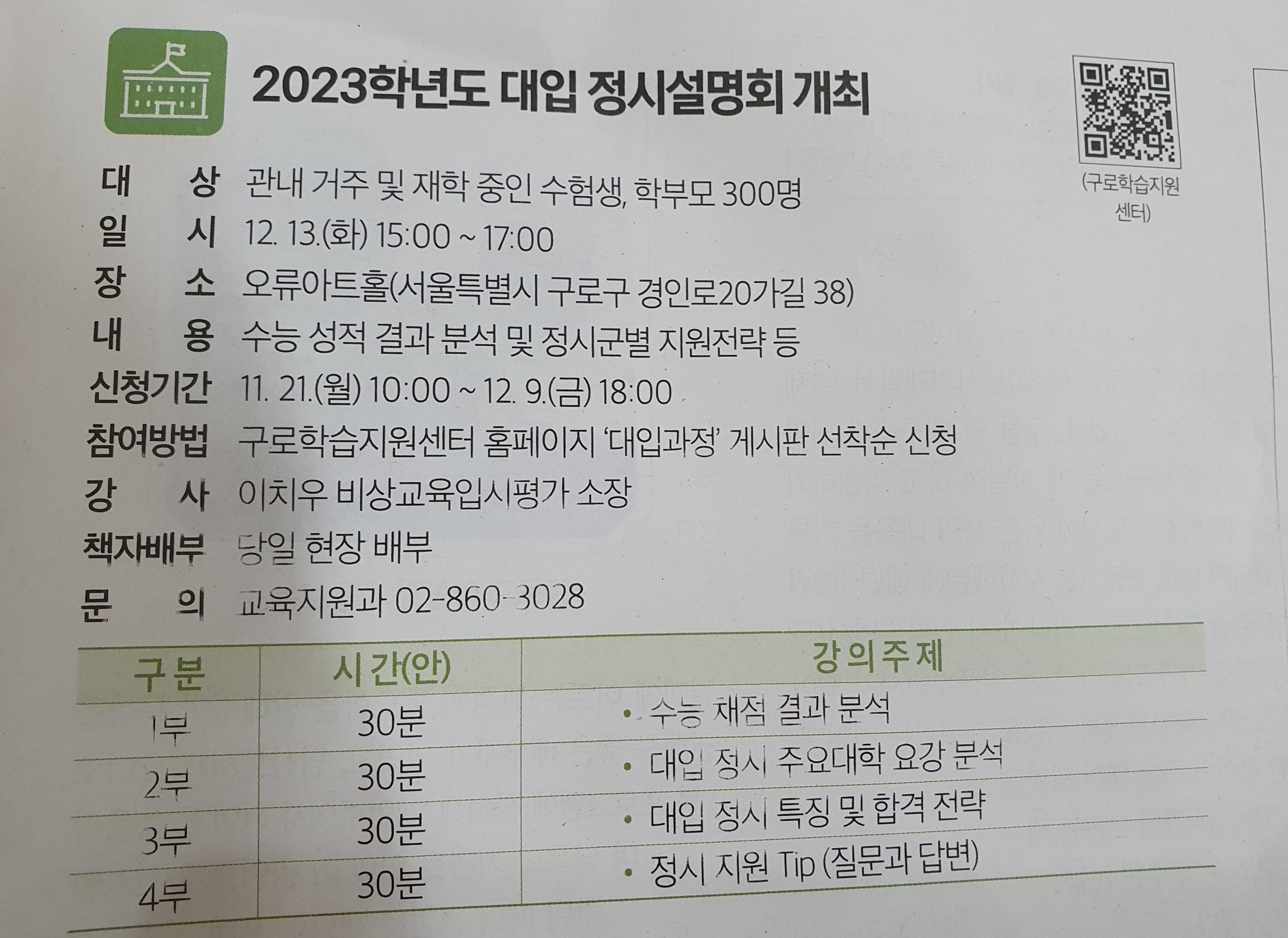 구로구 소식지 2022년 12월호 중에서 : 취학통지서 제출/ 송길영 특강/ 2023 대입 정시설명회/ 수요 야간 민원실