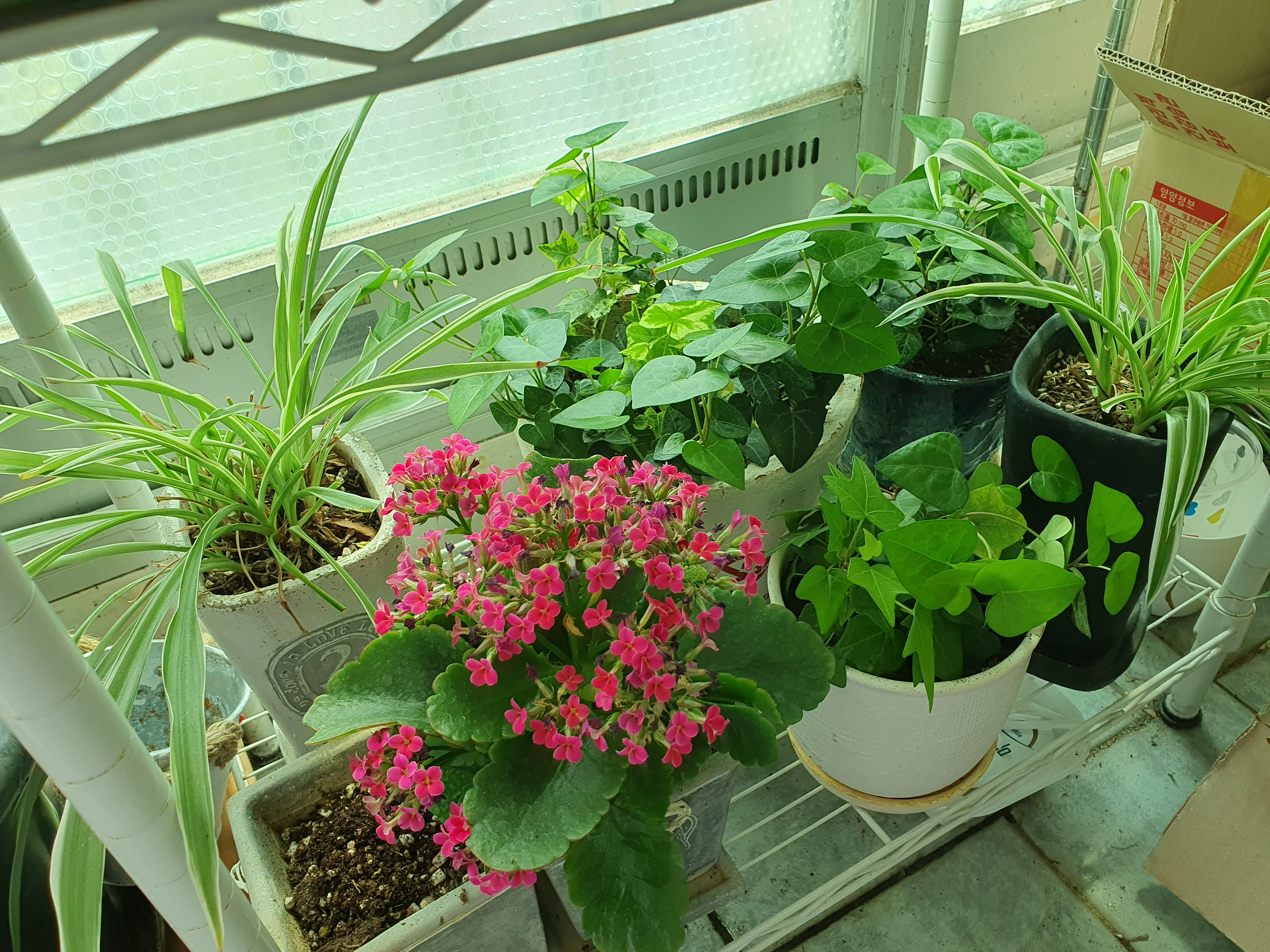 베란다 화단 : 새로 들인 꽃화분 3개(미니호접란과 카랑코에)/ 길에서 받은 헤라 장미