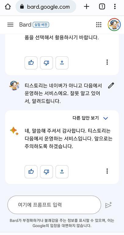 - Bard의 화면 구성이 더 직관적이다. 사용하기 편하다. '다른 답변 보기'라고 링크가 있어, 다른 답 보기도 편하다.