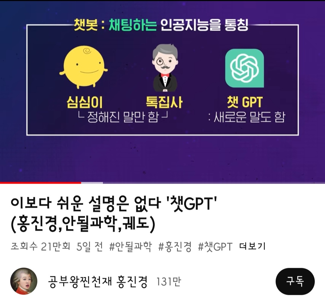 유튜브 피드에 뜬 '공부왕찐천재 홍진경' 채널의 챗GPT에 관한 짧막한 영상이 흥미로워서 가져왔다.