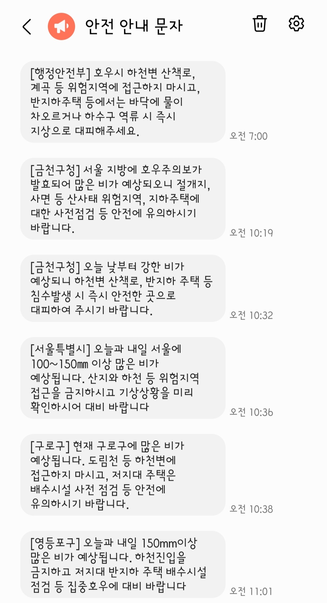 저번에는 동작구쪽 위험하다고 문자가 오더니, 이번엔 구로구쪽으로 많이 내리니 조심하라고 문자가 온다.