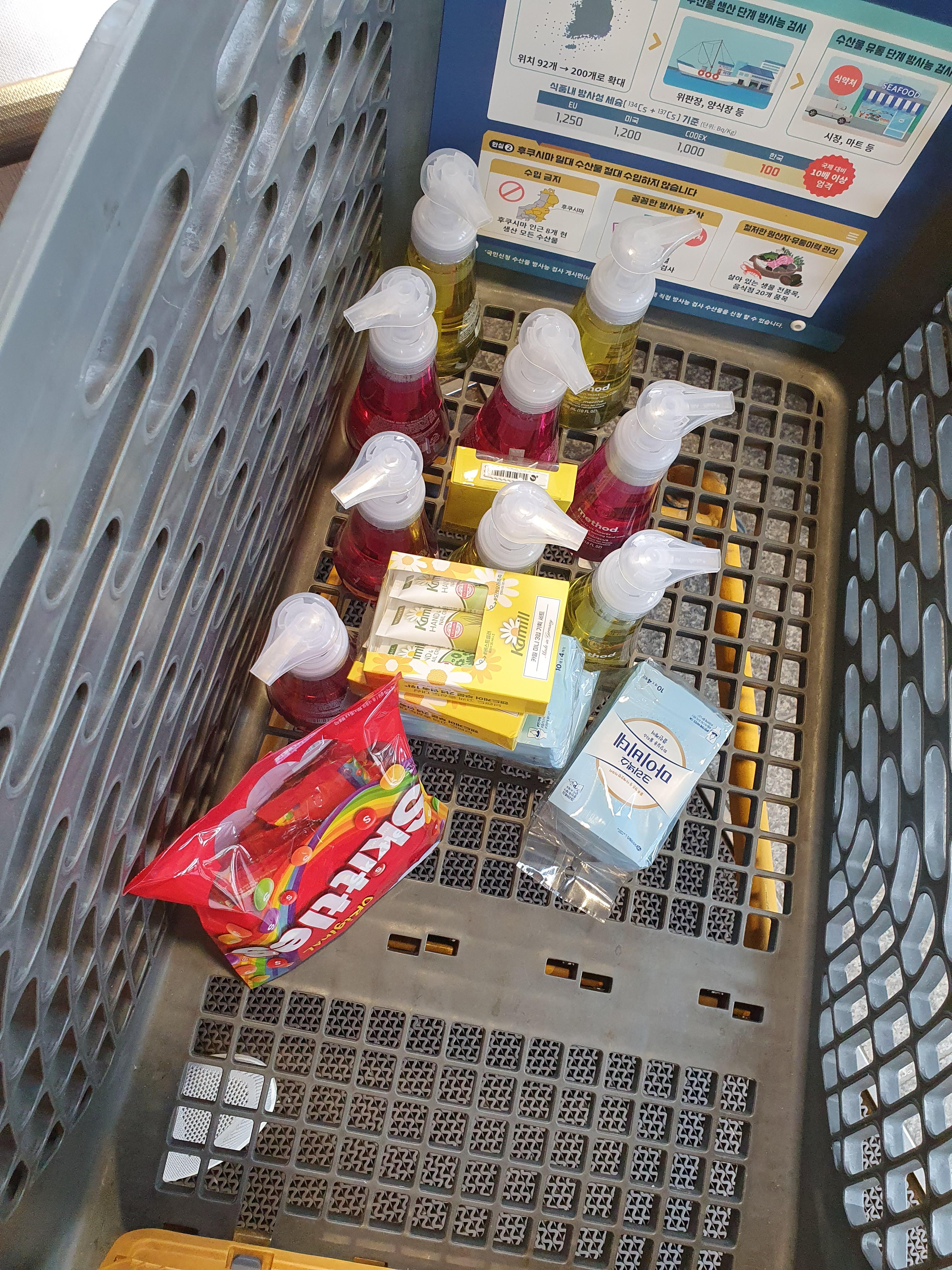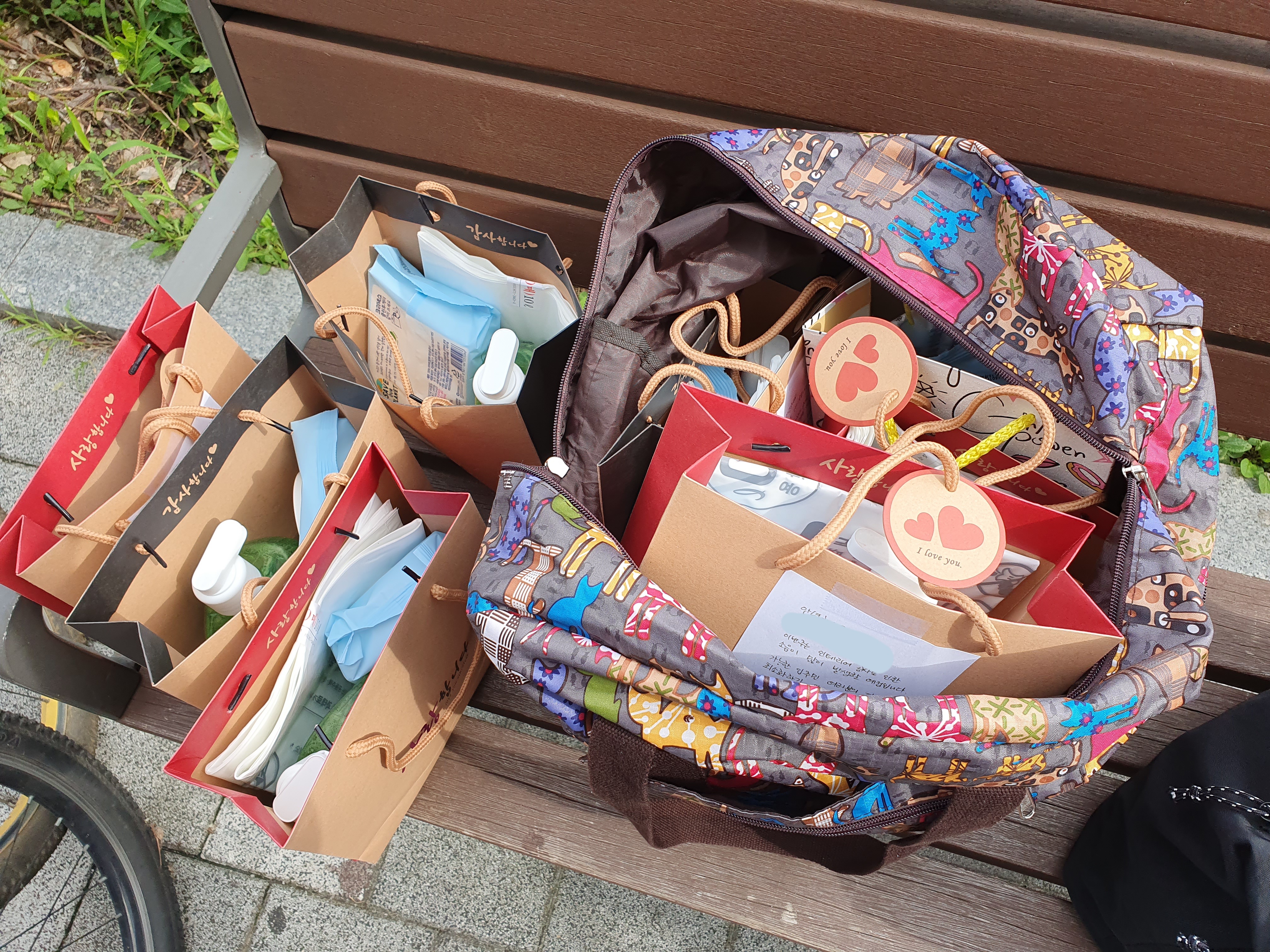 더운 것도 힘든데, 세제랑 물티슈 들어있는 짐가방이 무거워서 어깨랑 허리가 아팠다.