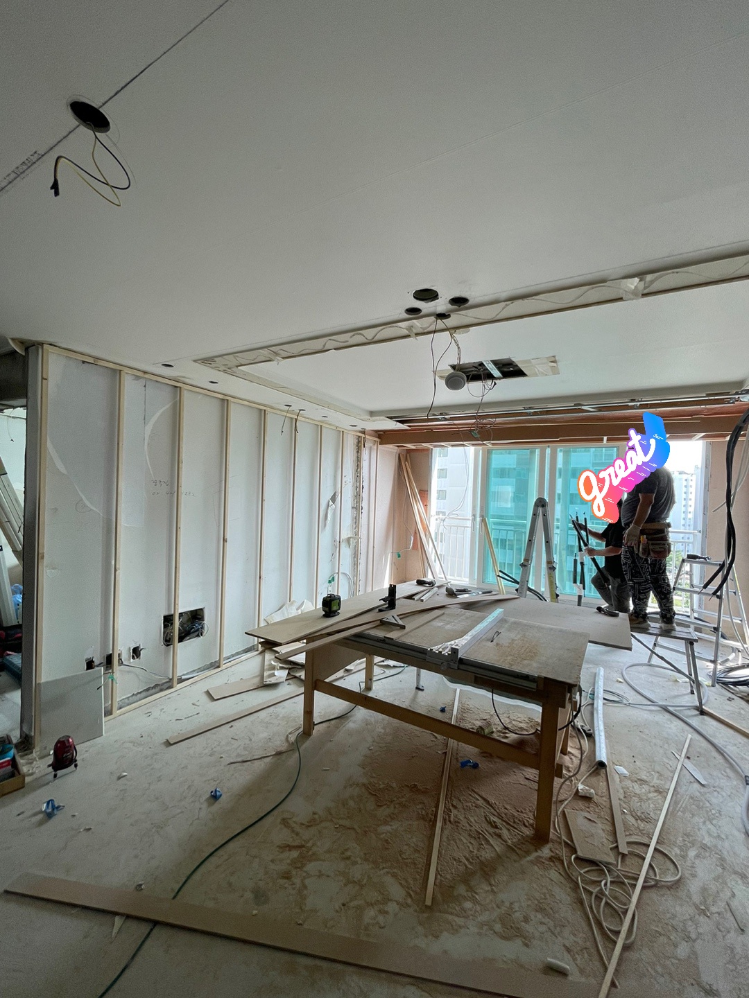 [인테리어공사 중간과정] 2. 샷시와 전기최대한 콘센트를 많이 따자. 하는 계획대로 하다보니 전기선 따는데 손이 많이 간 모양이다. 거실 샷시와 아이방(안방) 샷시도 새로 했다. 카톡으로 보내