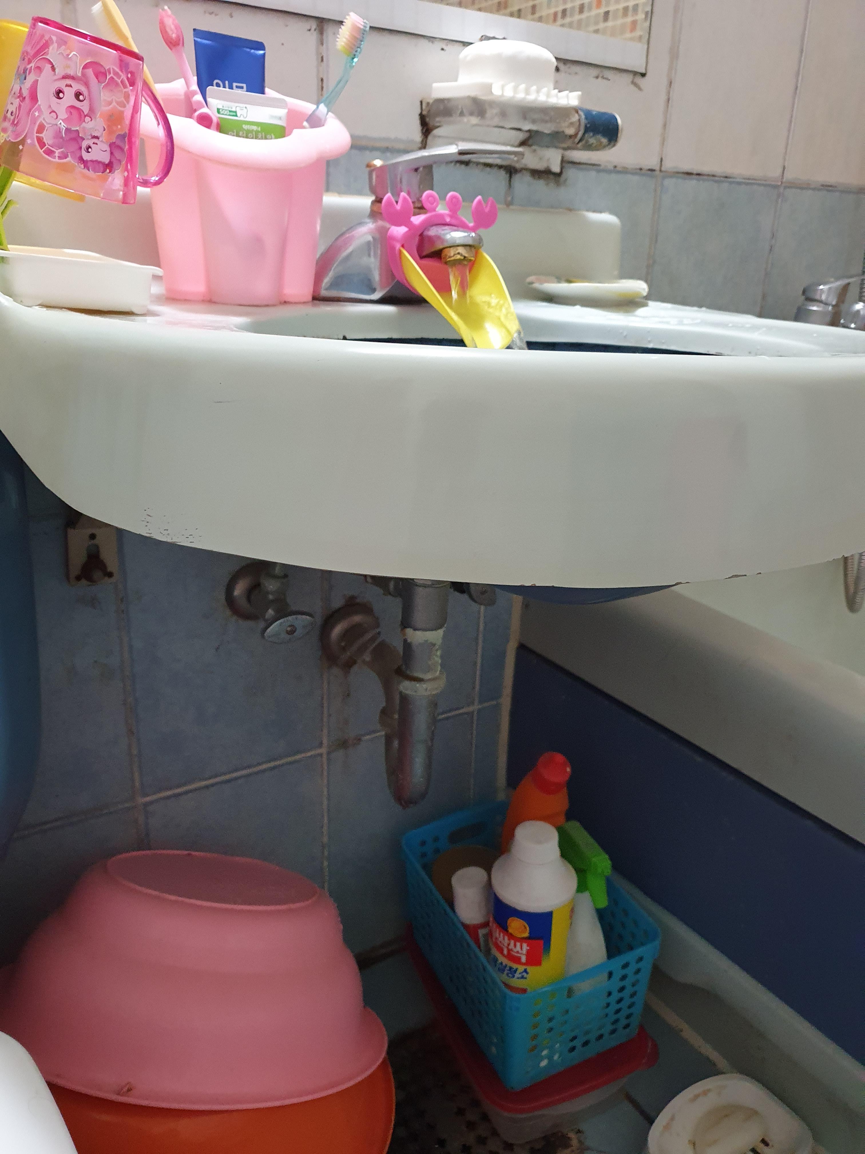 화장실 세면대에 문제가 생겼다.