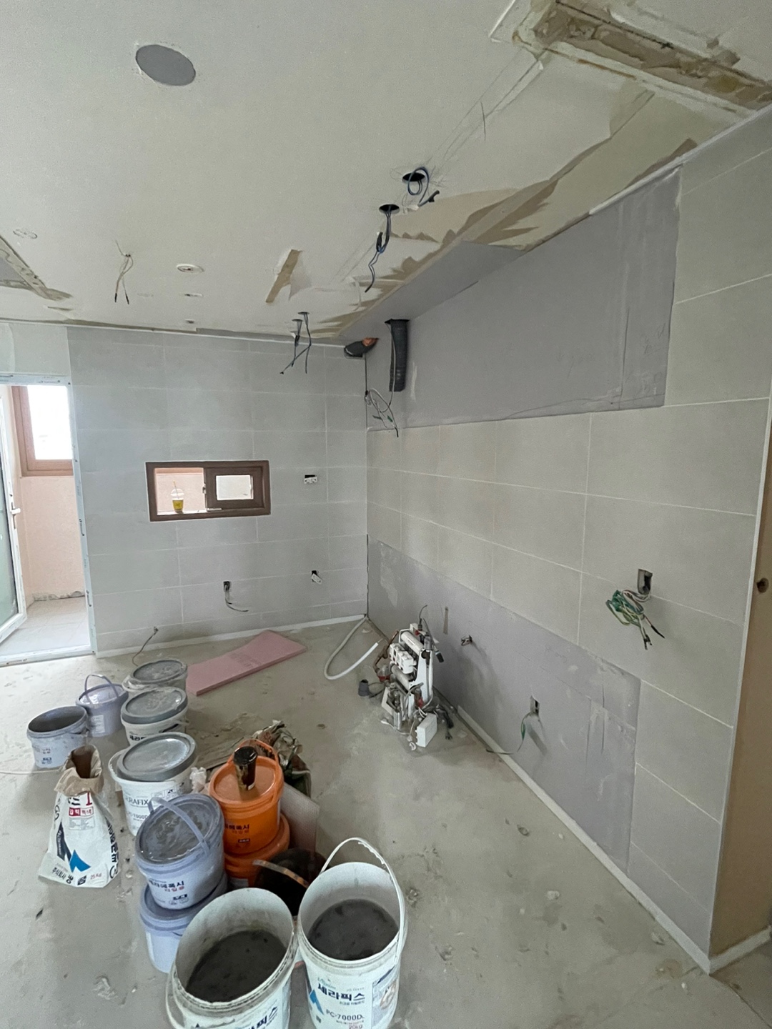 [인테리어공사 중간과정] 2. 샷시와 전기최대한 콘센트를 많이 따자. 하는 계획대로 하다보니 전기선 따는데 손이 많이 간 모양이다. 거실 샷시와 아이방(안방) 샷시도 새로 했다.카톡으로 보내
