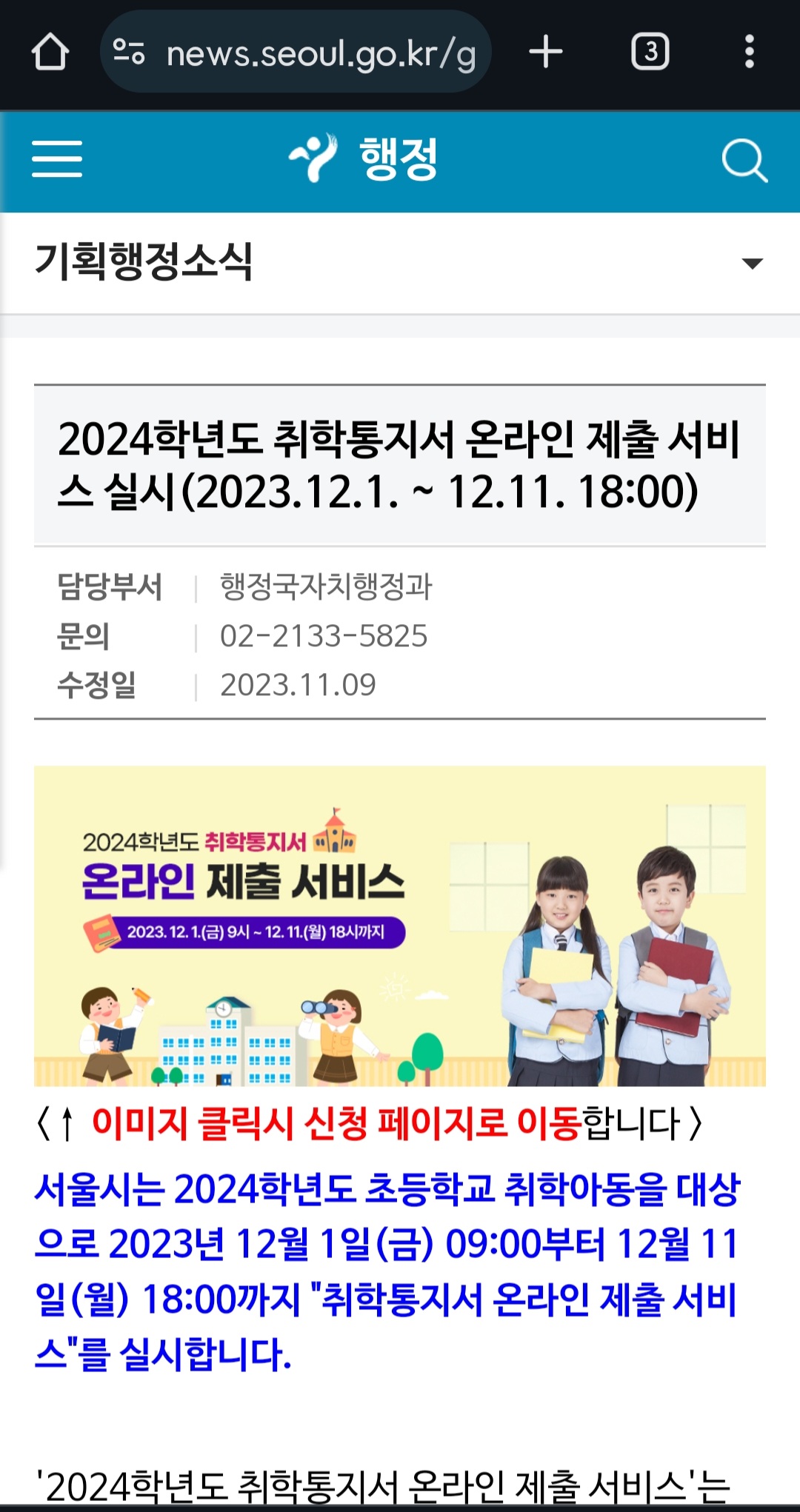 취학통지서 온라인 제출서비스 시작 (12.1 ~ 12.11) : 링크와 내용 갈무리 본문