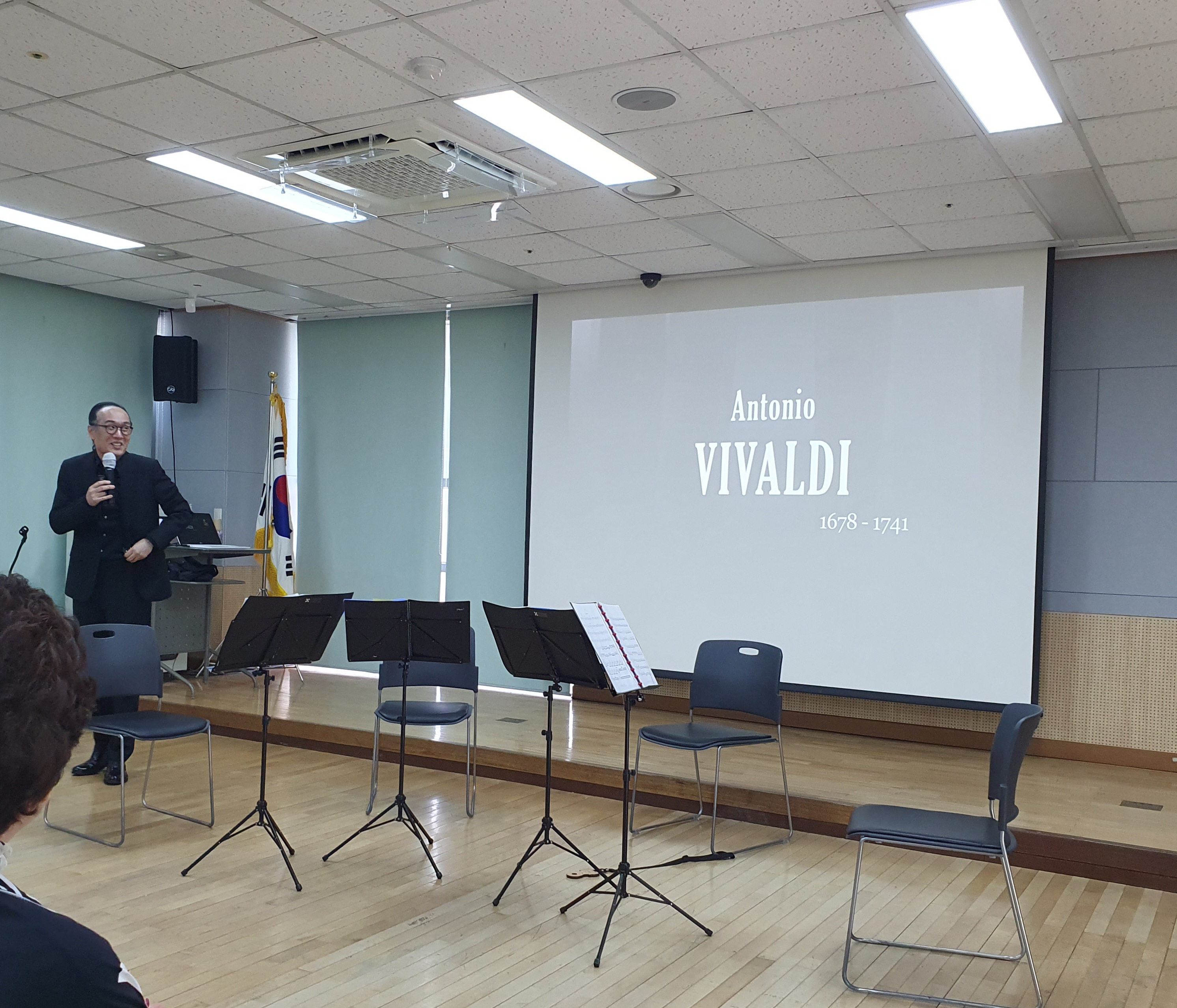 자리 배치가 이렇게 되어있었다. 원래는 연주자분들을 중심으로 동그랗게 자리배치를 한다고 했는데... 그렇게 하지 못했다고 했다. 책상만 뺀 형태로 자리 배치가 되어 있었다.