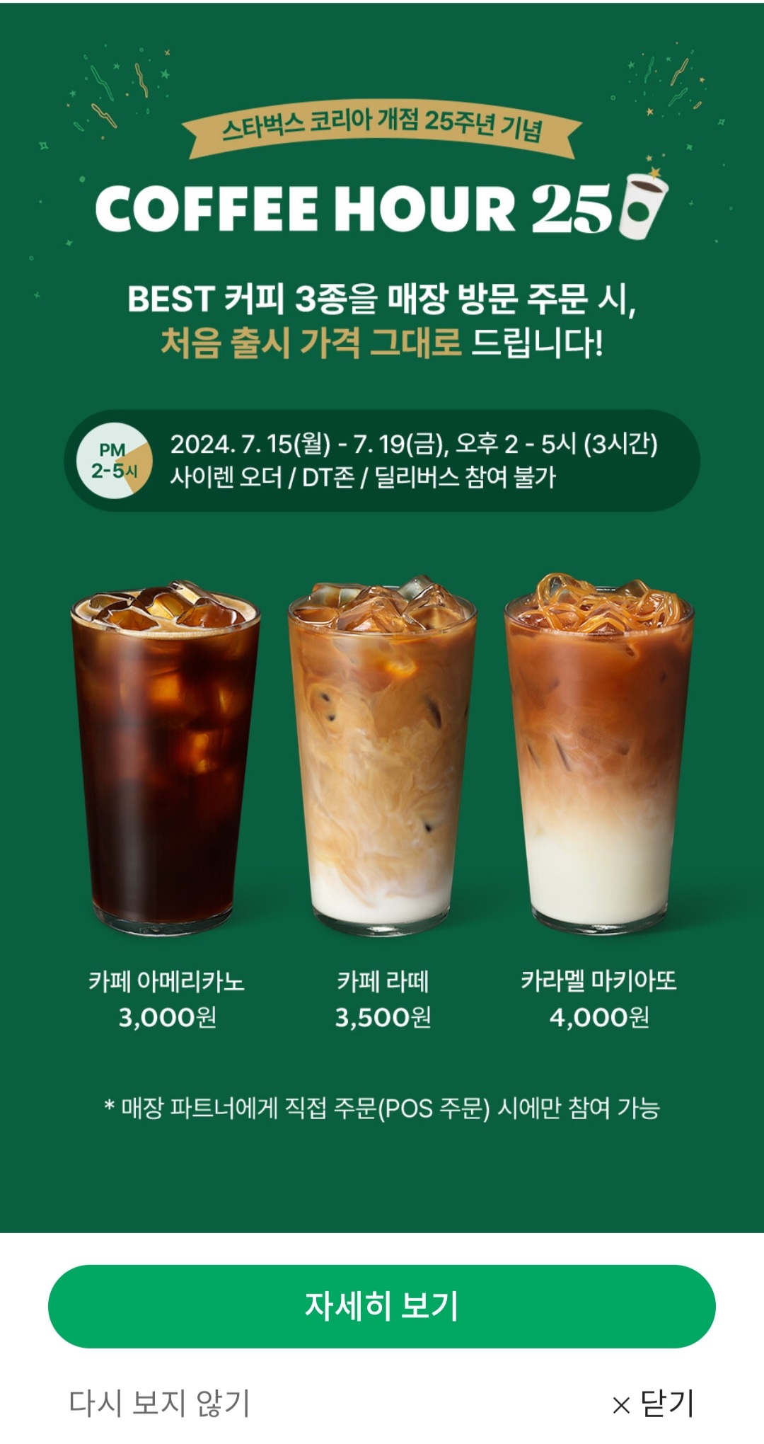 [내돈내산] 스타벅스 coffee hour25 이벤트 : 7/15~7/19 (오후2시~5시) 25년전 커피값으로 3종 구매 가능 (직접 주문시)