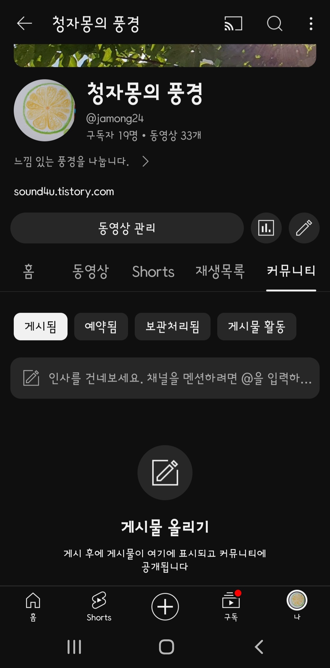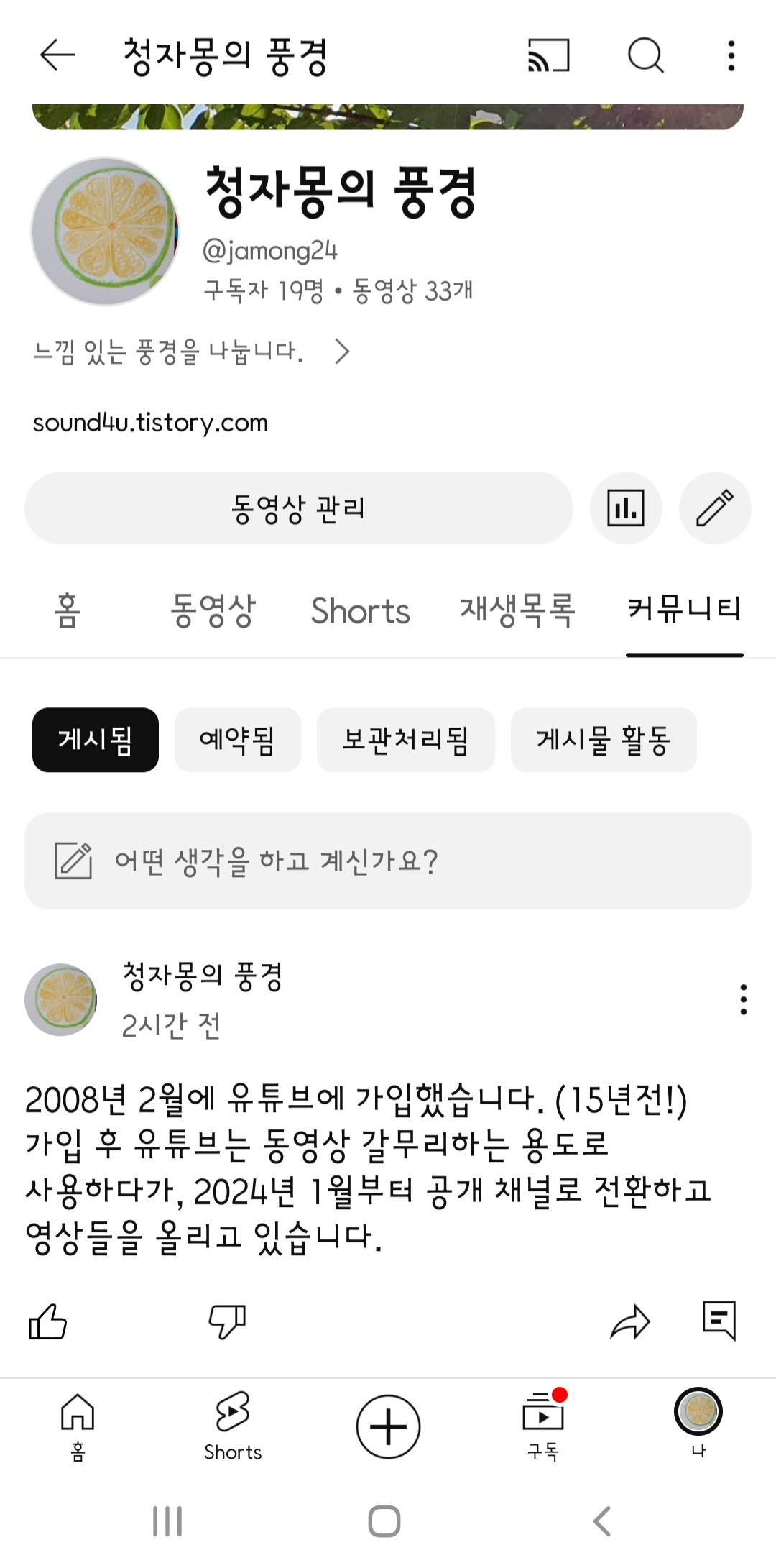 청자몽의 풍경 : 유튜브 채널 오픈 (공개모드로 전환했습니다.)