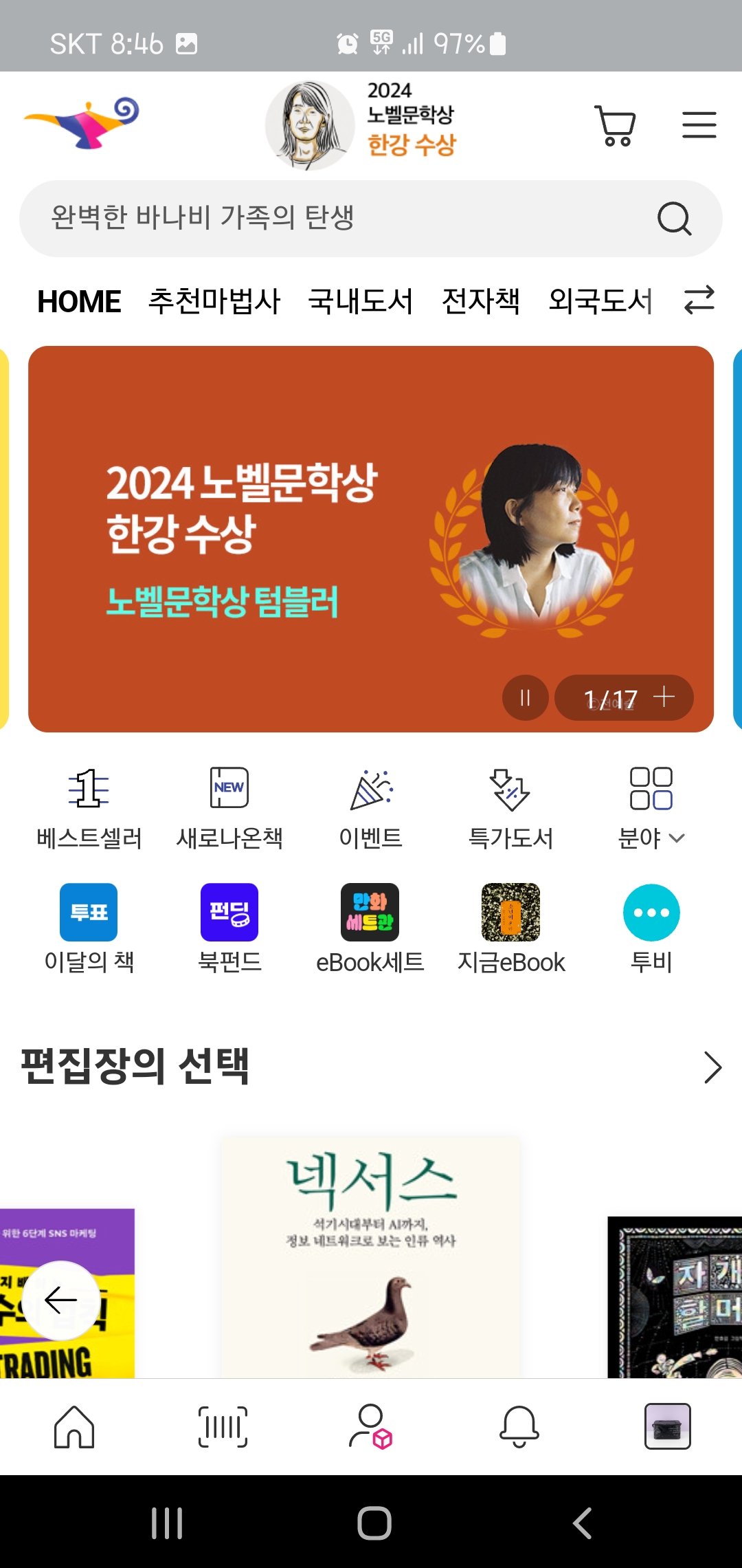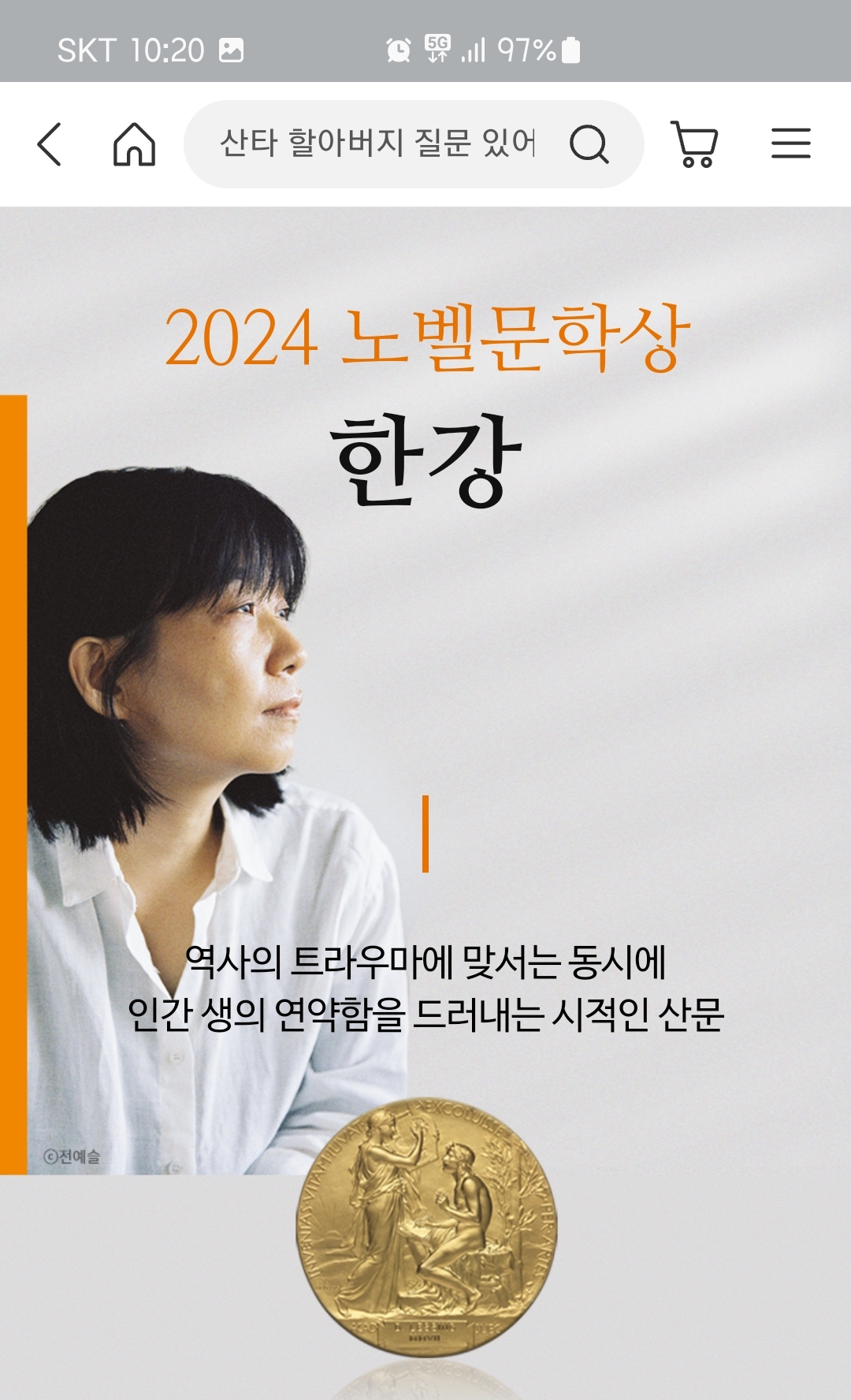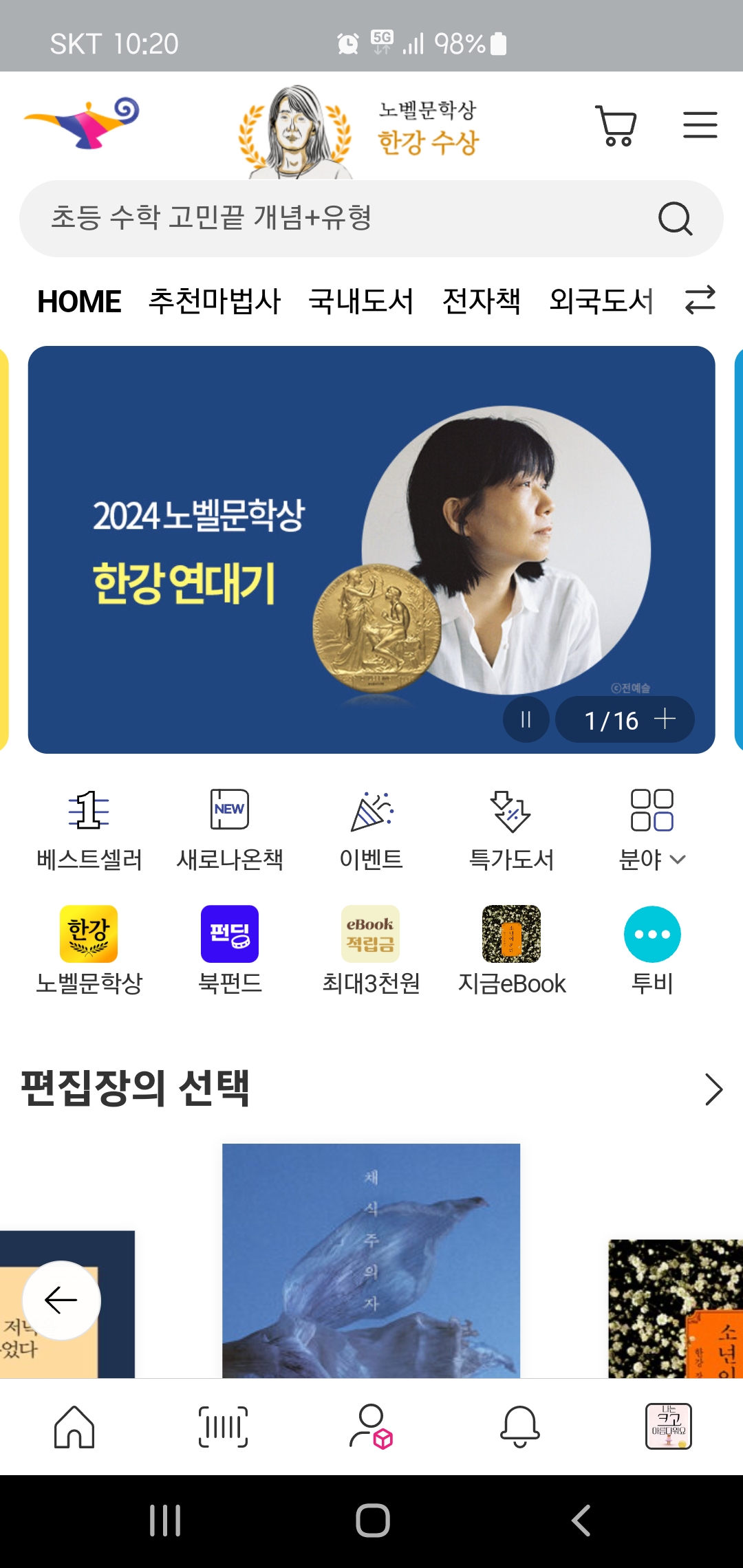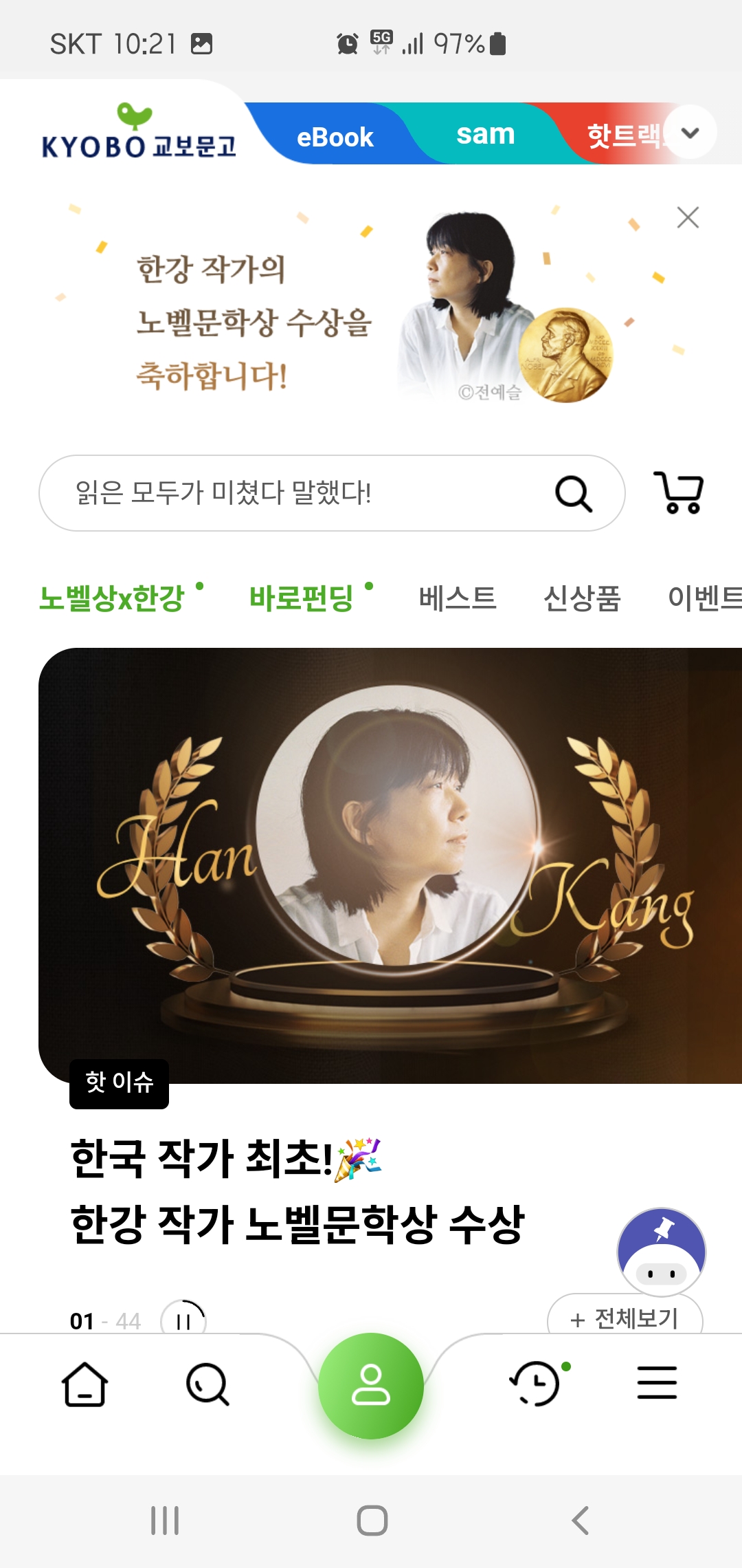 [앱 화면캡쳐] 2024 노벨문학상 한강 : 교보문고와 알라딘