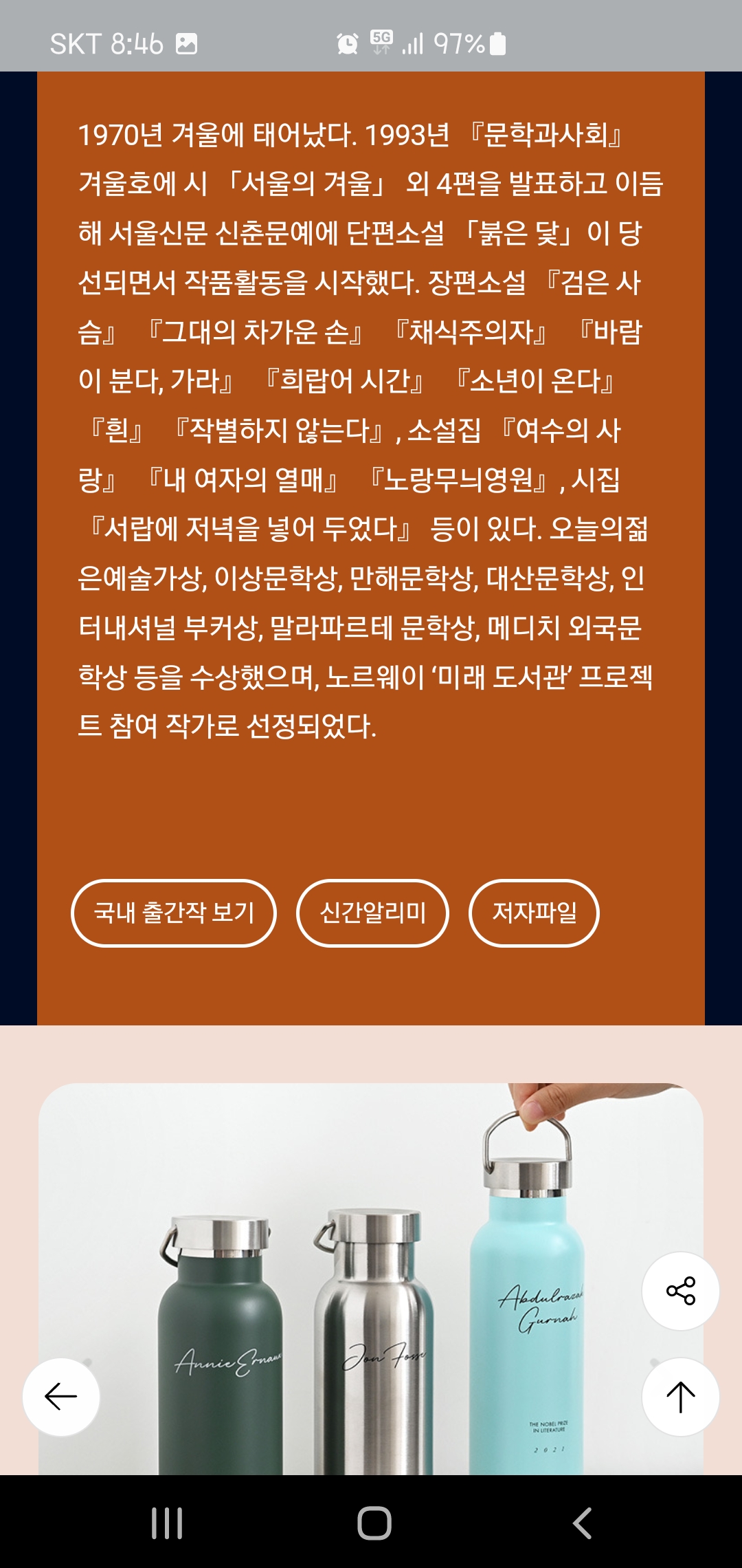 [앱 화면캡쳐] 2024 노벨문학상 한강 : 교보문고와 알라딘 본문
