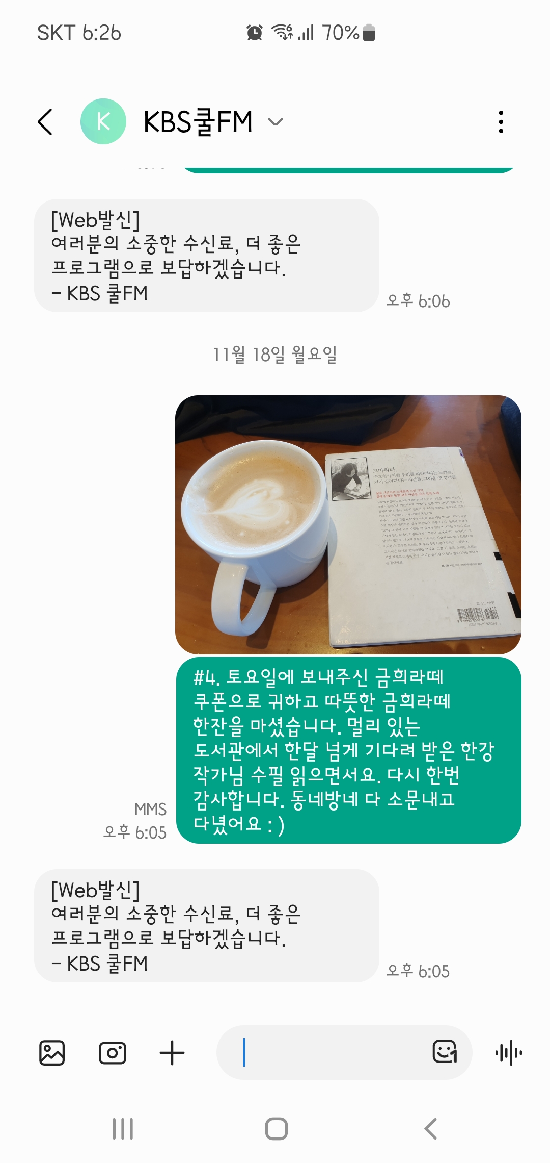 라떼 마시고 감사하다고 사진과 문자를 보냈다.