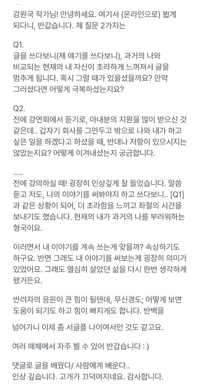 그래도 마침 지난주에 강원국 작가님께 질문하라고 하셔서, 용기를 내어 질문을 올렸습니다.