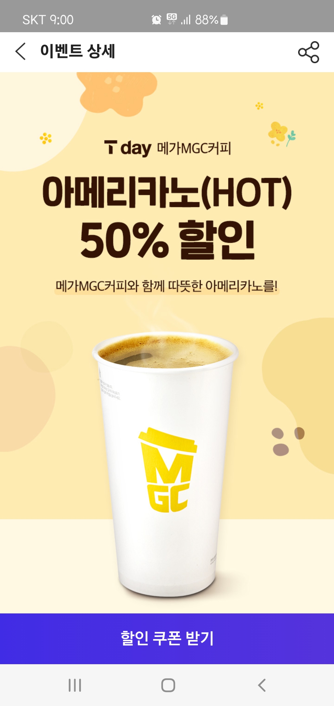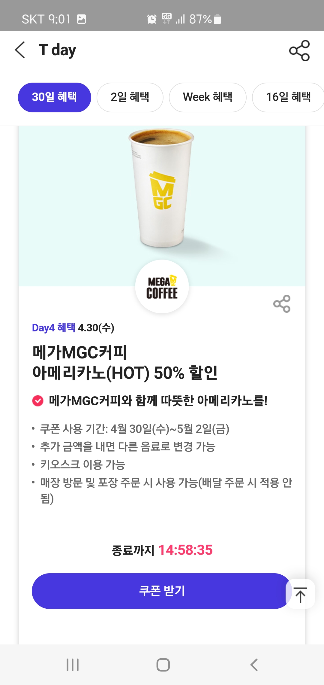 [내돈내산] 4월 30일, 메가커피 50% 할인(따뜻한 아메리카노) - T멤버십 본문
