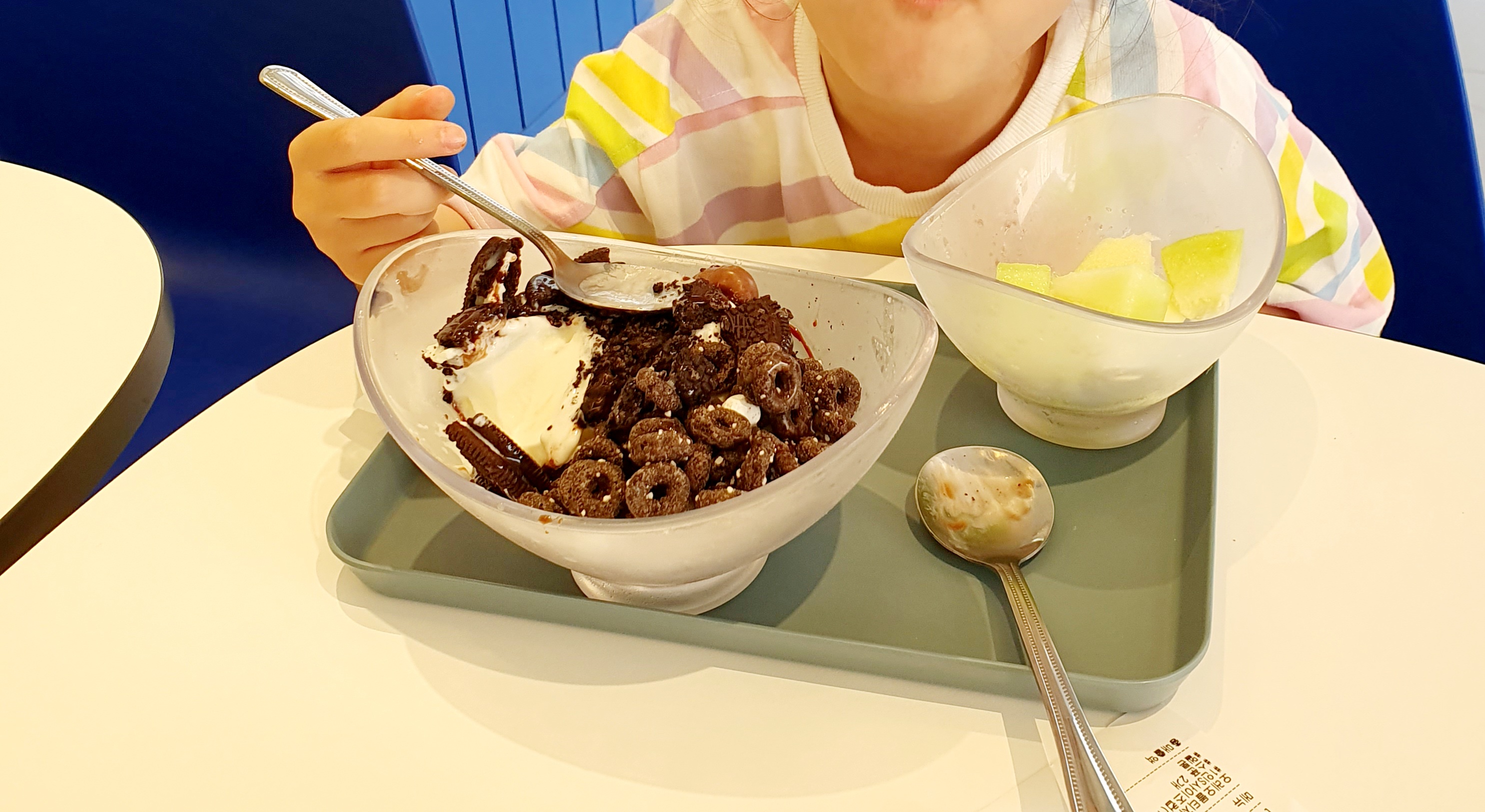 어제 아이가 먹고 싶다던, 요거트 아이스크림을 먹었다. 예상했던 것처럼 아이는 위에 토핑과 곁들임 과일만 좋아했다. 남은 아이스크림은 조금 먹다가 나도 포기했다. 아쉽다. 하면서 자리를 정리했다.