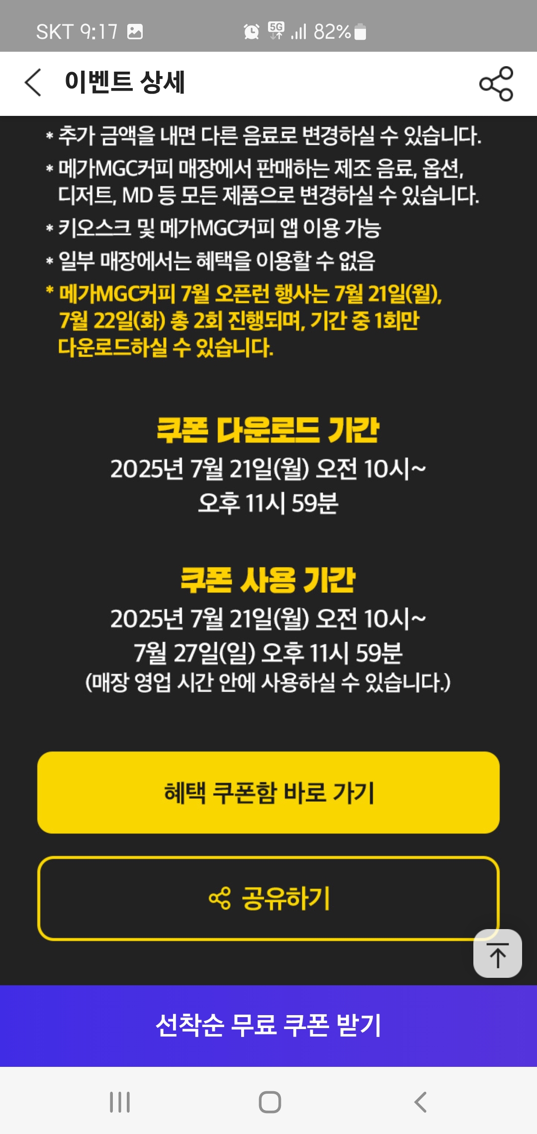 SK텔레콤, 고객감사 패키지/ T멤버십 메가커피 무료 커피 쿠폰 예고(7월 21일 다운로드 가능)