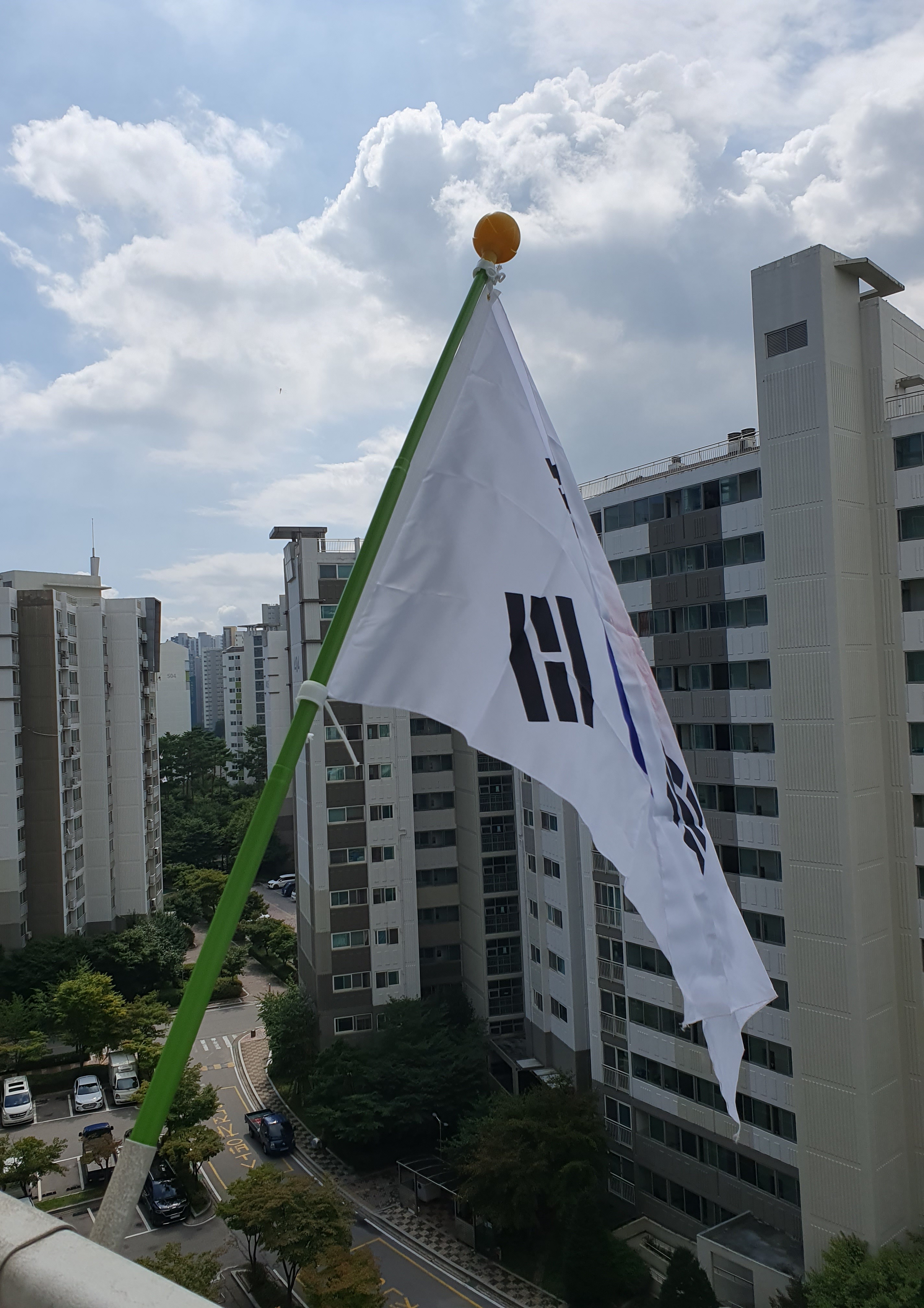 아파트에서 안내방송 나와서 투덜거리며 태극기 꺼내어 걸었다. 나도 꺼내려고 했었는데... 다른 날도 아니고 광복 80주년이다.