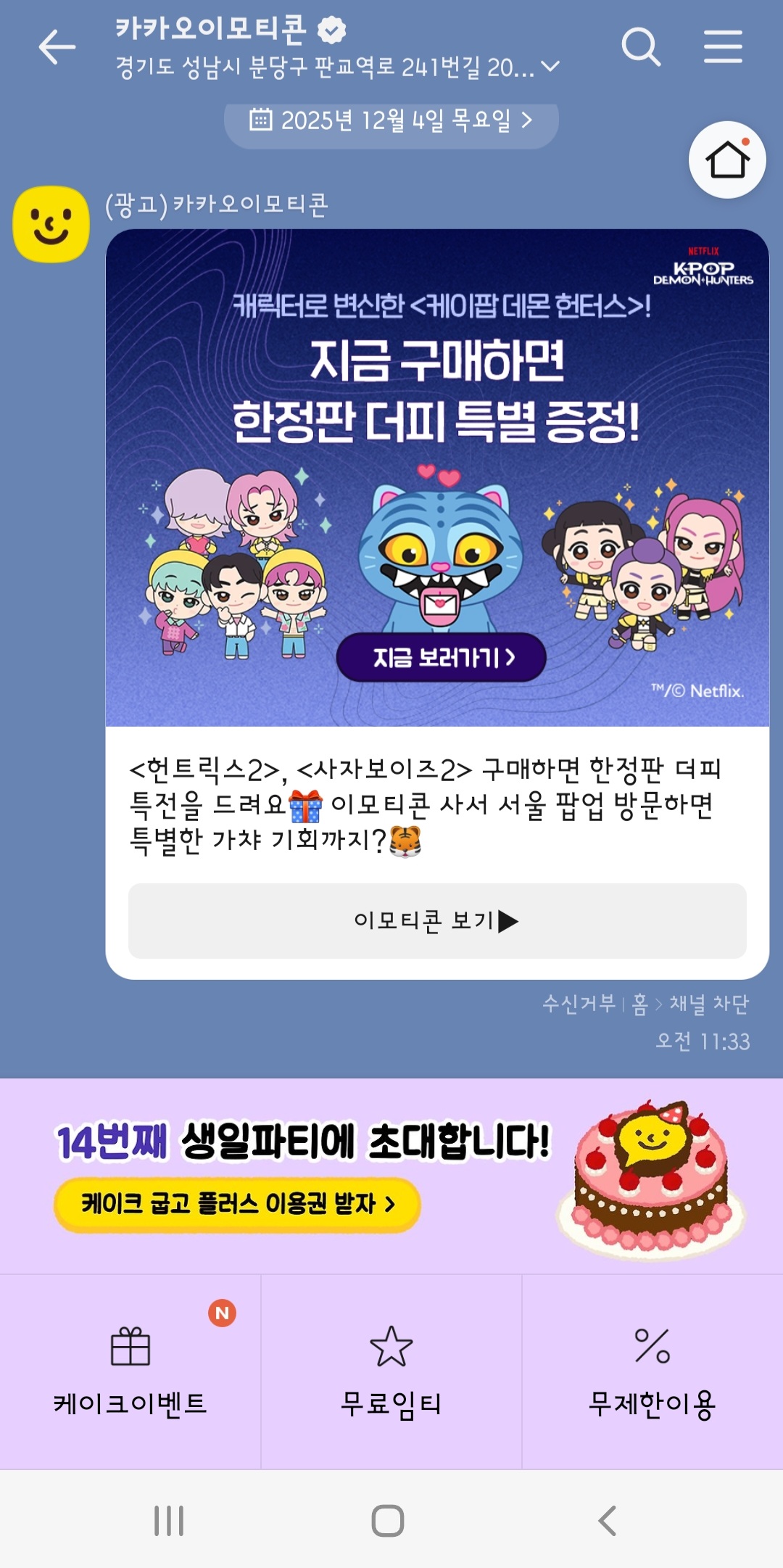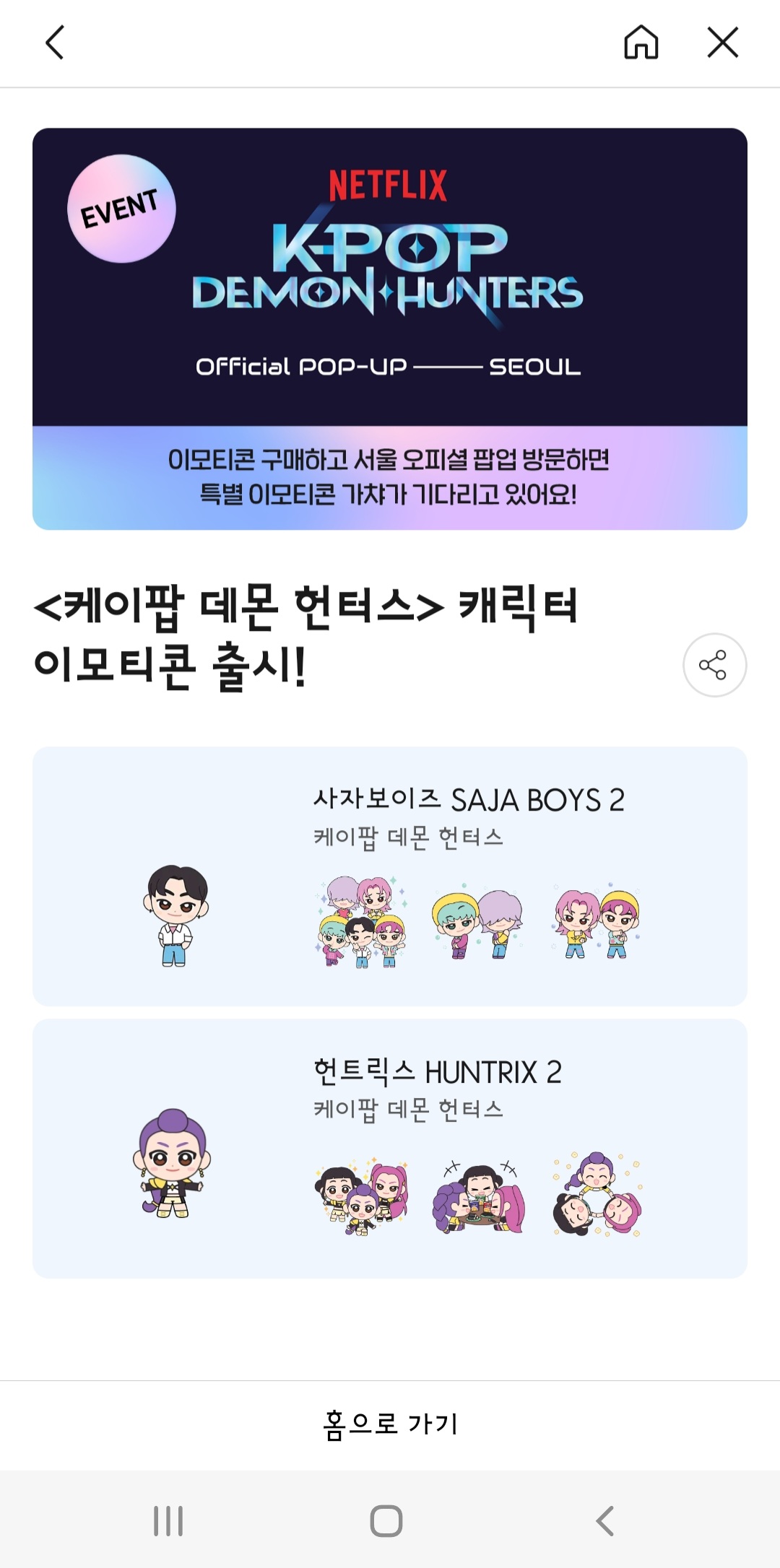 이모티콘을 그저 그런가보다 하고 넘겨보다가, 위에 광고로 뜨는 '케이팝 데몬 헌터스 서울 오피셜 팝업 스토어'가 눈에 띄길래 찾아봤다.