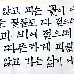 초급반 7주 과정 중에 다섯번째 수업을 들었다!! (이제 2번 더 남았다)이번 시간에는 "필압체"를 배웠다. 획을 시작하고 마칠때 힘을 주는 방식으로 글씨를 썼다. 선생님 말씀은 캘리그라피에 여러가지 글씨체가 많지만초급반에서 배우는 직선체, 곡선체, 필압체가 중요하다고 하셨다. 획마다 힘을 줘서 꺽거나 긋거나 하면서 열심히 쓰다보니, 문득 예전에 국민학교(^^ 응?) 서예반에서 글쓰던 생각이 났다. 이렇게 힘줬다가 살짝 덜 줬다가 하는 기법을 많이 사용했던거 같다. 나눠주신 교재보면서 열심히 쓰고 있었더니, 글씨에 힘이 있다고 한석봉 나오셨다고 옆에서 놀린다.근데 익숙한 형태를 연습해서 그런지, 쓰는 나도 재밌었다. 게다가 연습하는 문구도 요며칠 내가 느꼈던 감정들을 정리(마무리)해주는 것 같아서 한구절..