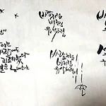 [고급반1회]냅킨에 글씨 써보기(화선지 말고 다른 재질에 적용해보기) 두둥~! 2주만에 새로운 수업이 시작됐다. 어느새 고급반 수업을 듣는다. 고급반 수업을 듣는다는거지, 글씨가 고급스럽게 늘었다는건 아니다. 첫시간에는 몸풀기겸 해서 다른 재질의 종이에 써보기를 했다. 표면이 우둘두둘한 냅킨(일명 올록뽈록 엠보싱이 된)에 글자를 써봤다. 선생님이 쓰신 작품을 따라서 써봤다. 캘리그라피는 글자 하나 하나보다 전체적인 구도와 어울림이 중요한 것 같다. 따라 써본다고 썼는데, 비슷하기 쓰지는 못했다. 우둘두둘한 재질에 글씨를 쓰다보니 번짐이나 강약 조절이 생각보다 어려웠다. 그래도 도전해볼만했다. 다시 빡센 월요일 저녁 수업이 시작됐다! 석달동안 열심히 해보자! 2015/12/07 - [글그리기] - [고급반..
